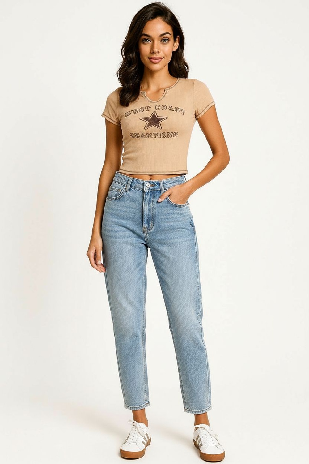 Playera de tejido acanalado con estampado frontal tipo lettering y estrella al centro, cuello redondo con terminación contrastante, manga corta y corte al cuerpo que ofrece una silueta definida con textura ligera