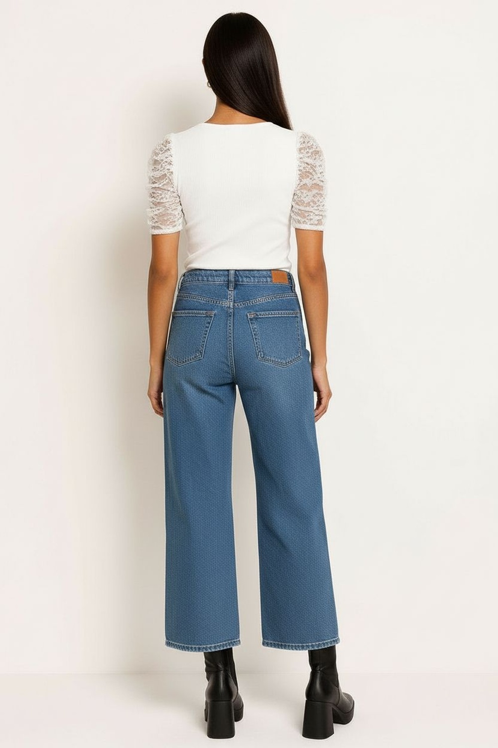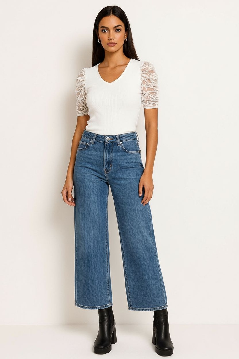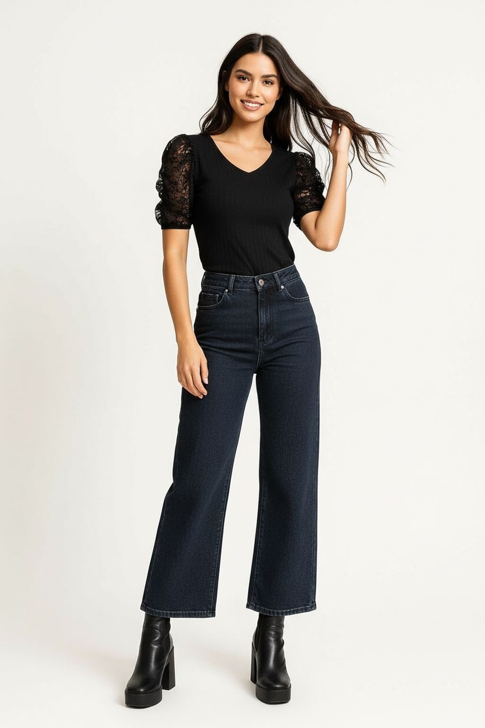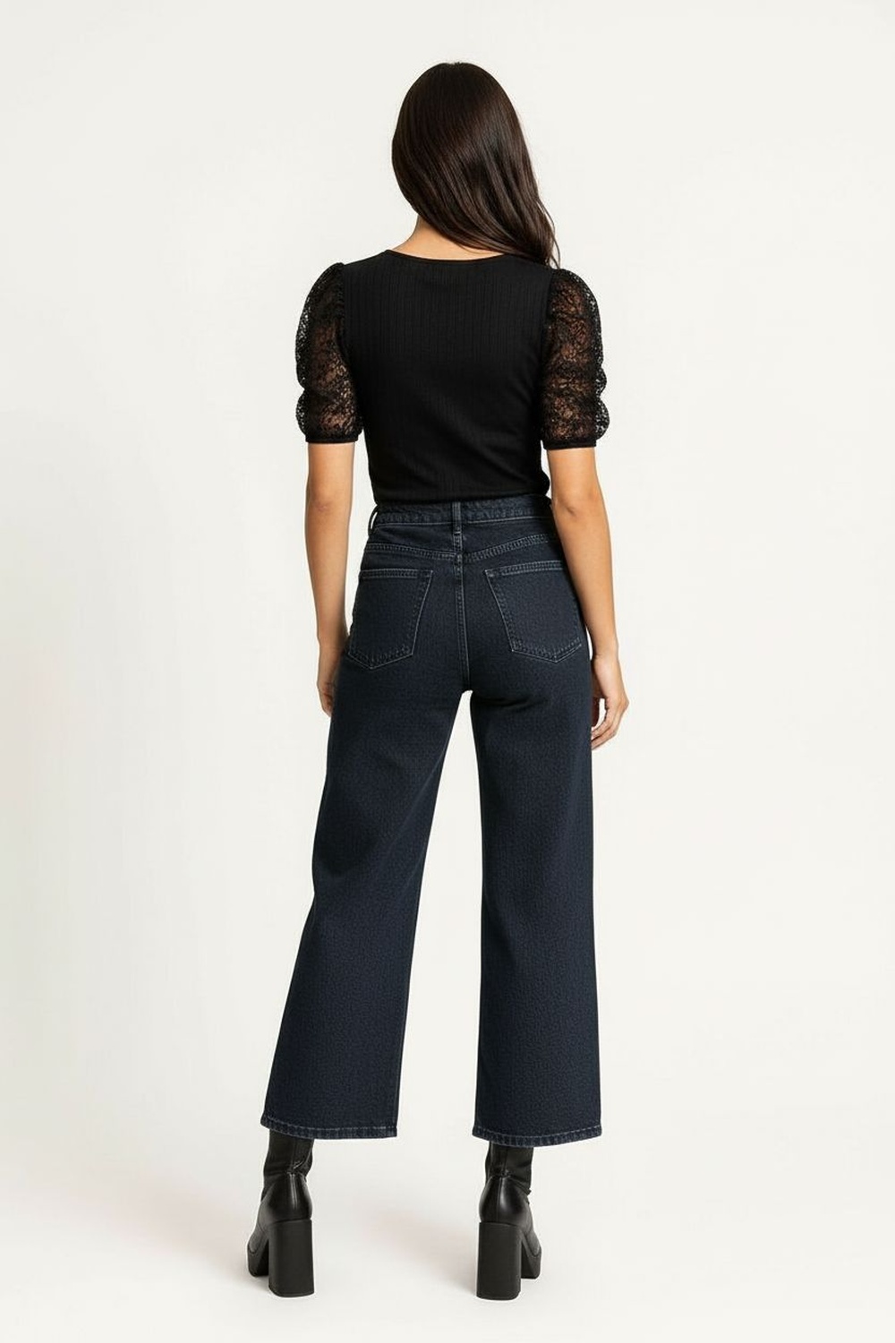 Pantalón amplio de tiro alto con pretina tipo corset que define la zona media, detalle de cinta ajustable al frente que permite adaptar la medida con mayor precisión, pierna ancha de caída fluida que aporta movimiento al caminar, largo completo que equilibra la silueta, confección en tejido ligero de tacto agradable con excelente adaptación al cuerpo