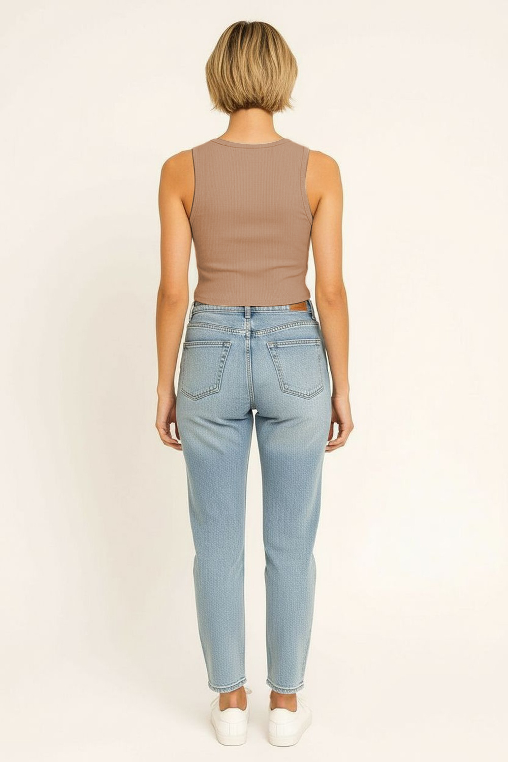 Playera sin mangas confeccionada en tejido rib que se adapta al cuerpo, escote redondo con estructura firme, aplicación de moños decorativos al frente y costados como detalle distintivo, corte corto que marca la silueta, terminaciones limpias que aportan un acabado cuidado