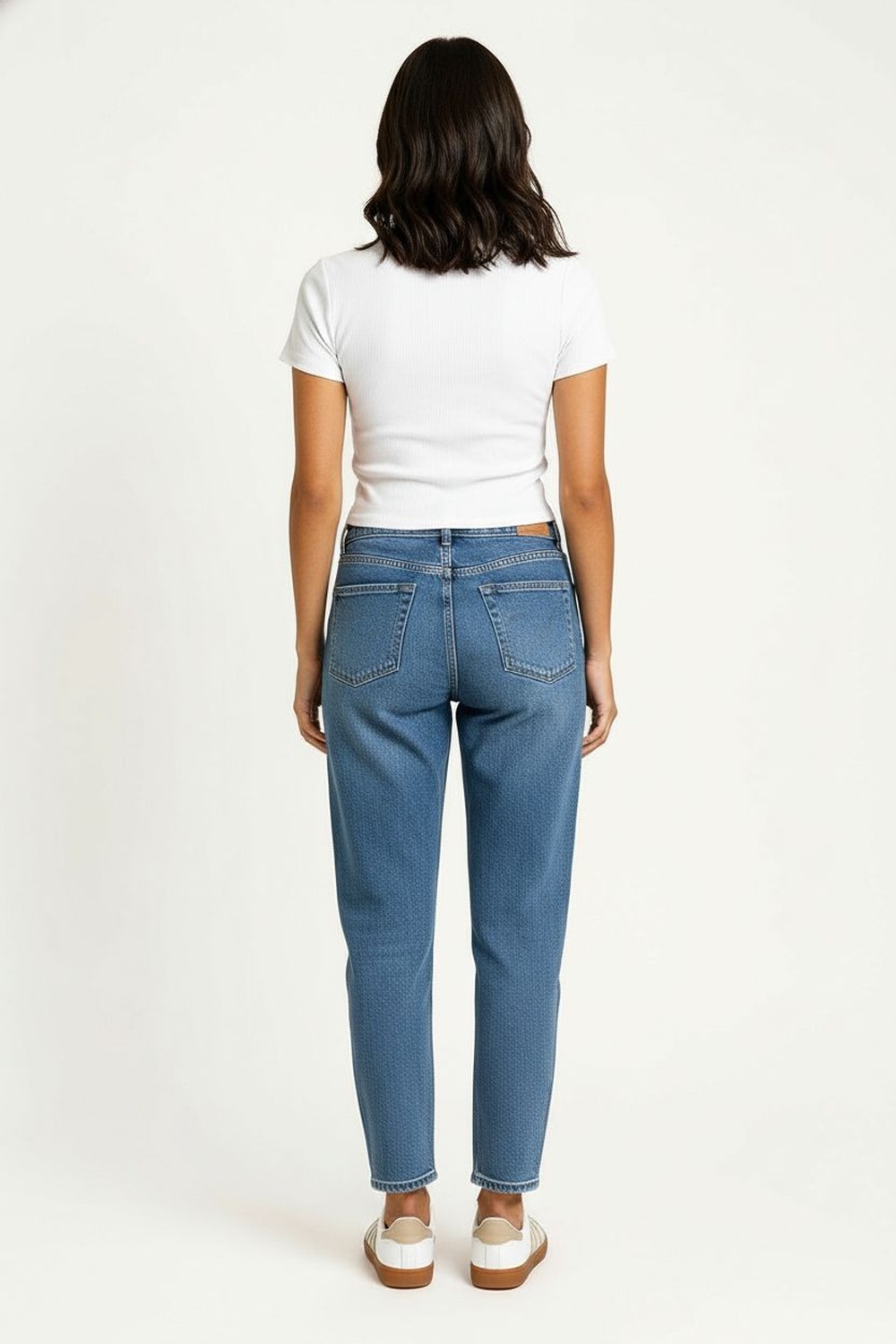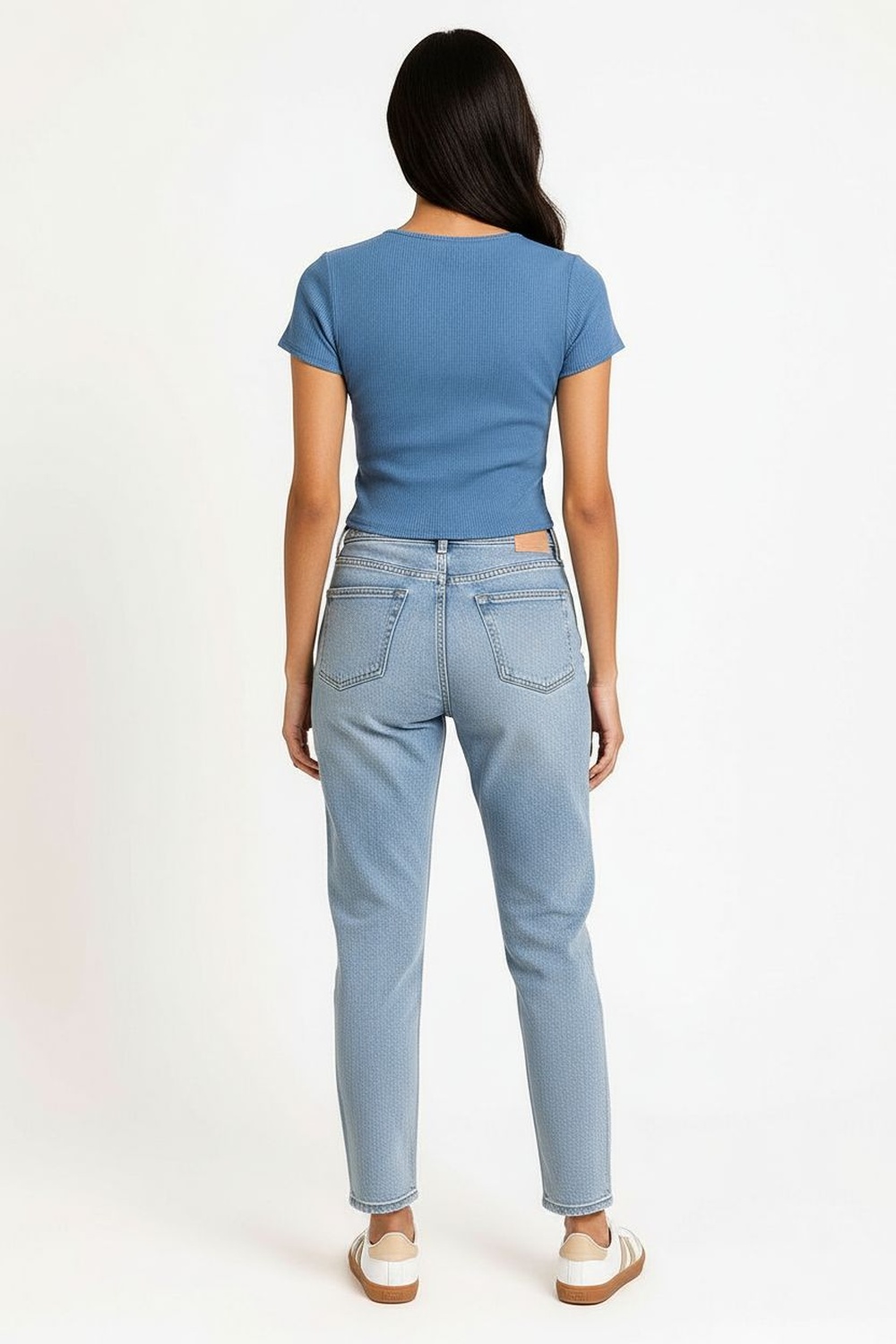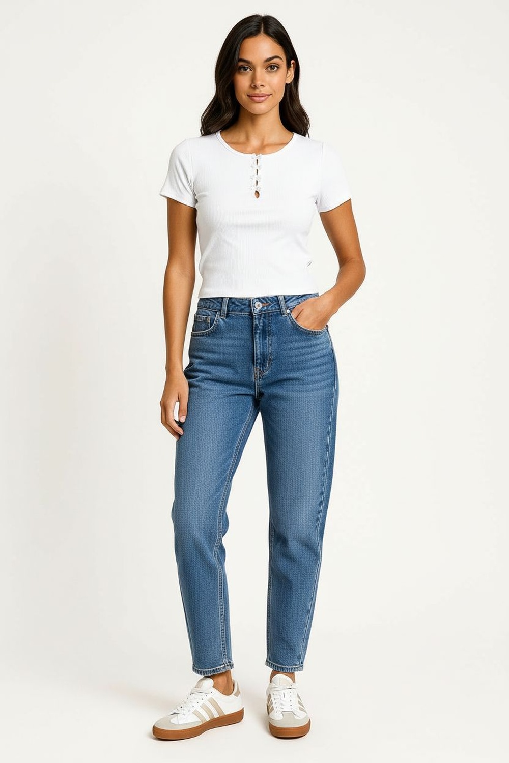 Jeans NYD confeccionado en mezclilla con corte ajustado y cintura media, diseño de cinco bolsillos funcionales que aportan practicidad, cierre con botón metálico al frente y costuras firmes que definen la estructura, tejido con leve elasticidad que brinda confort y mejor ajuste al cuerpo