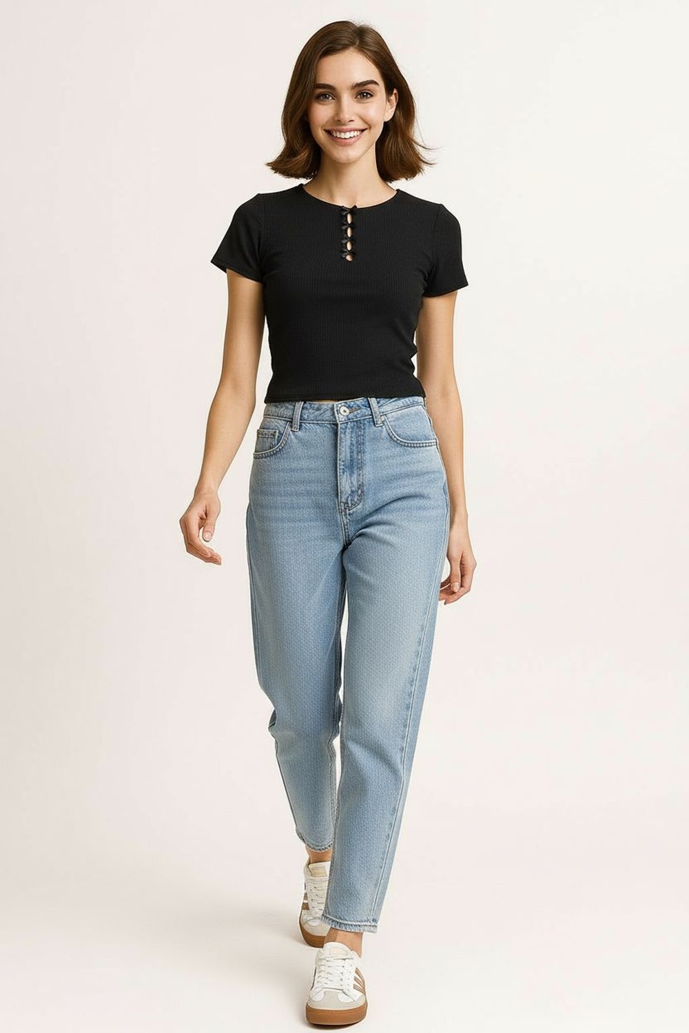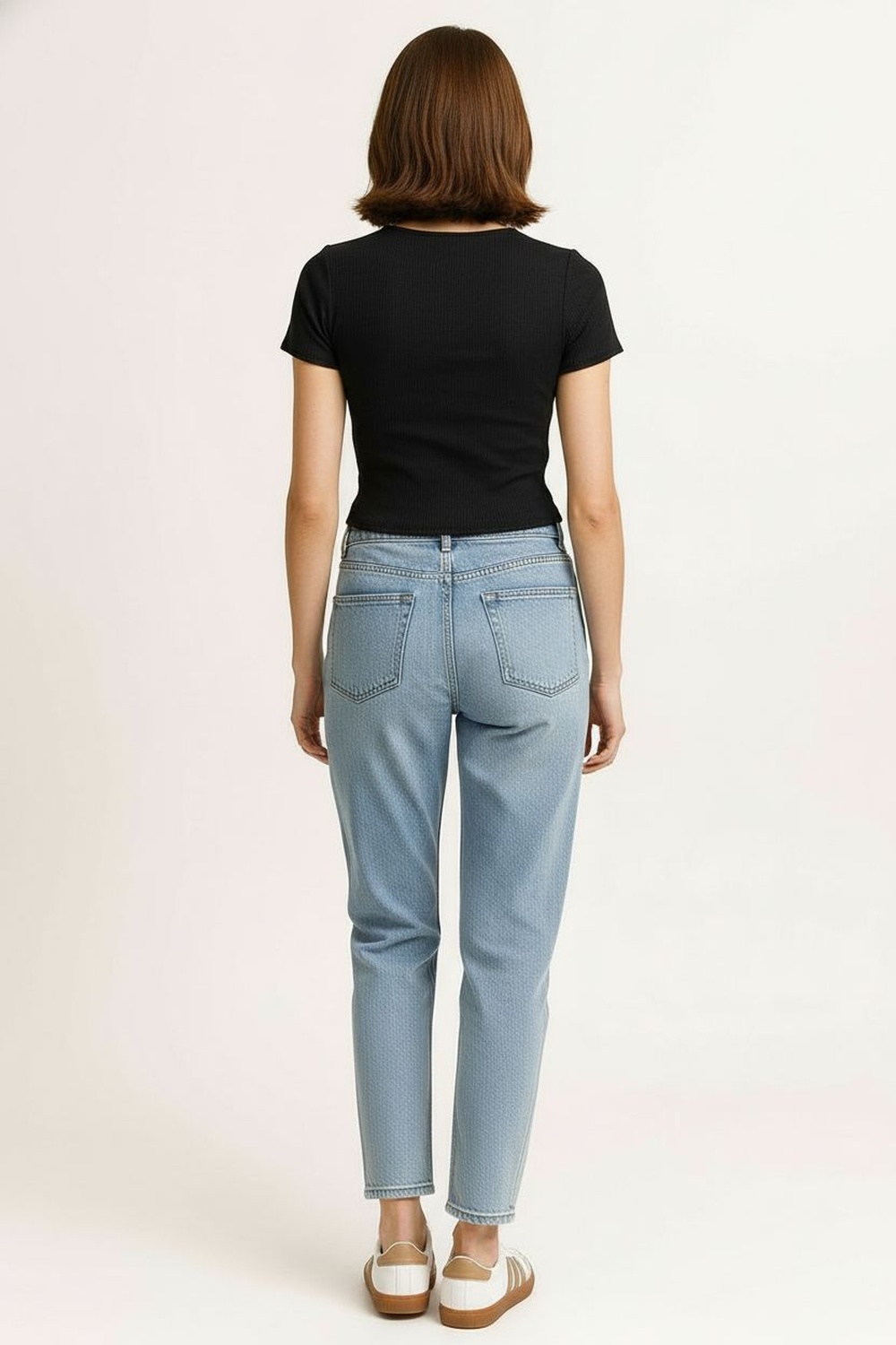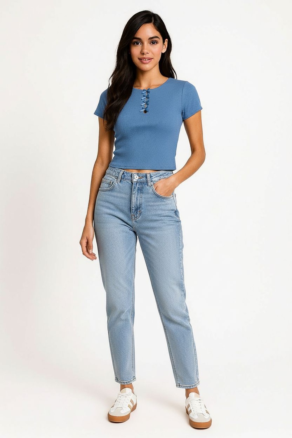 Jeans NYD confeccionado en mezclilla con corte ajustado y cintura media, diseño de cinco bolsillos funcionales que aportan practicidad, cierre con botón metálico al frente y costuras firmes que definen la estructura, tejido con leve elasticidad que brinda confort y mejor ajuste al cuerpo
