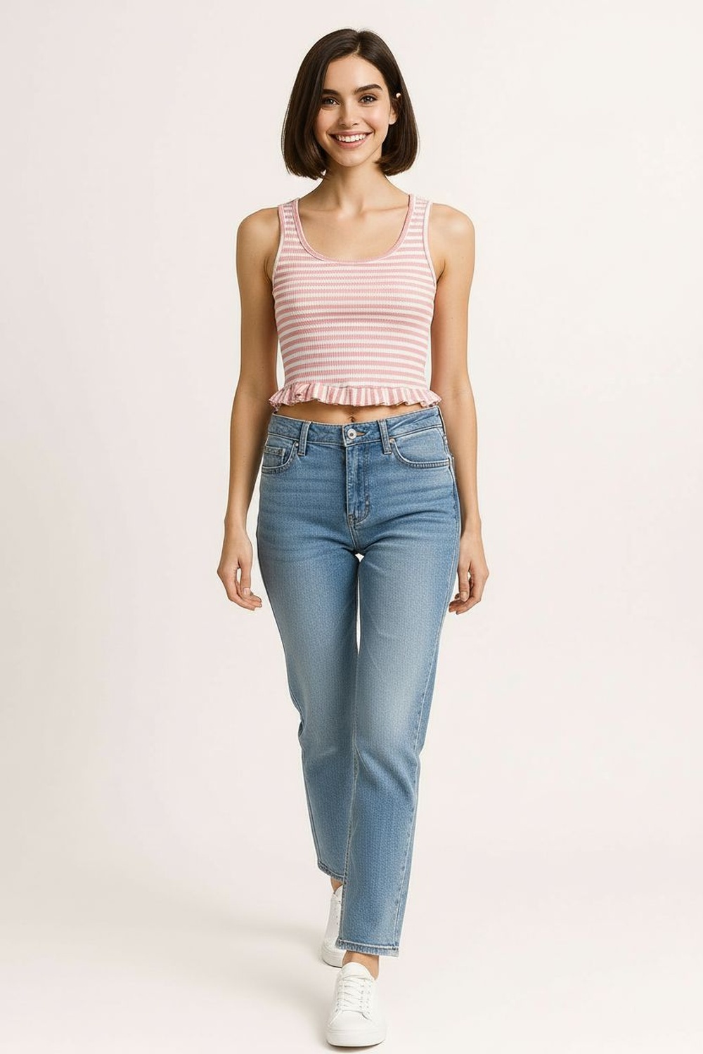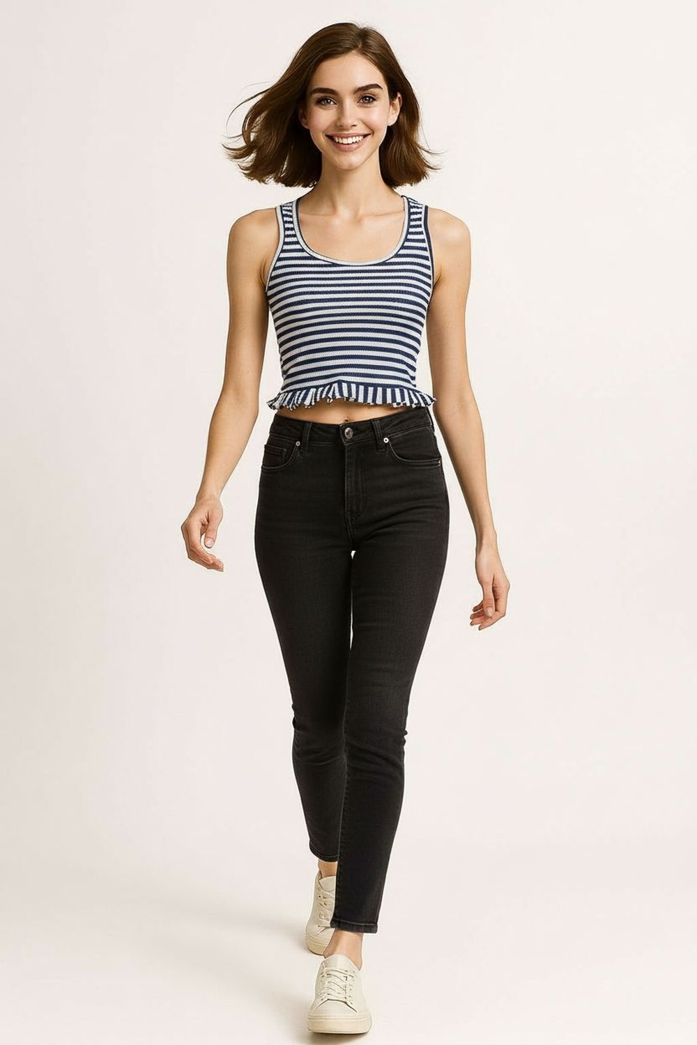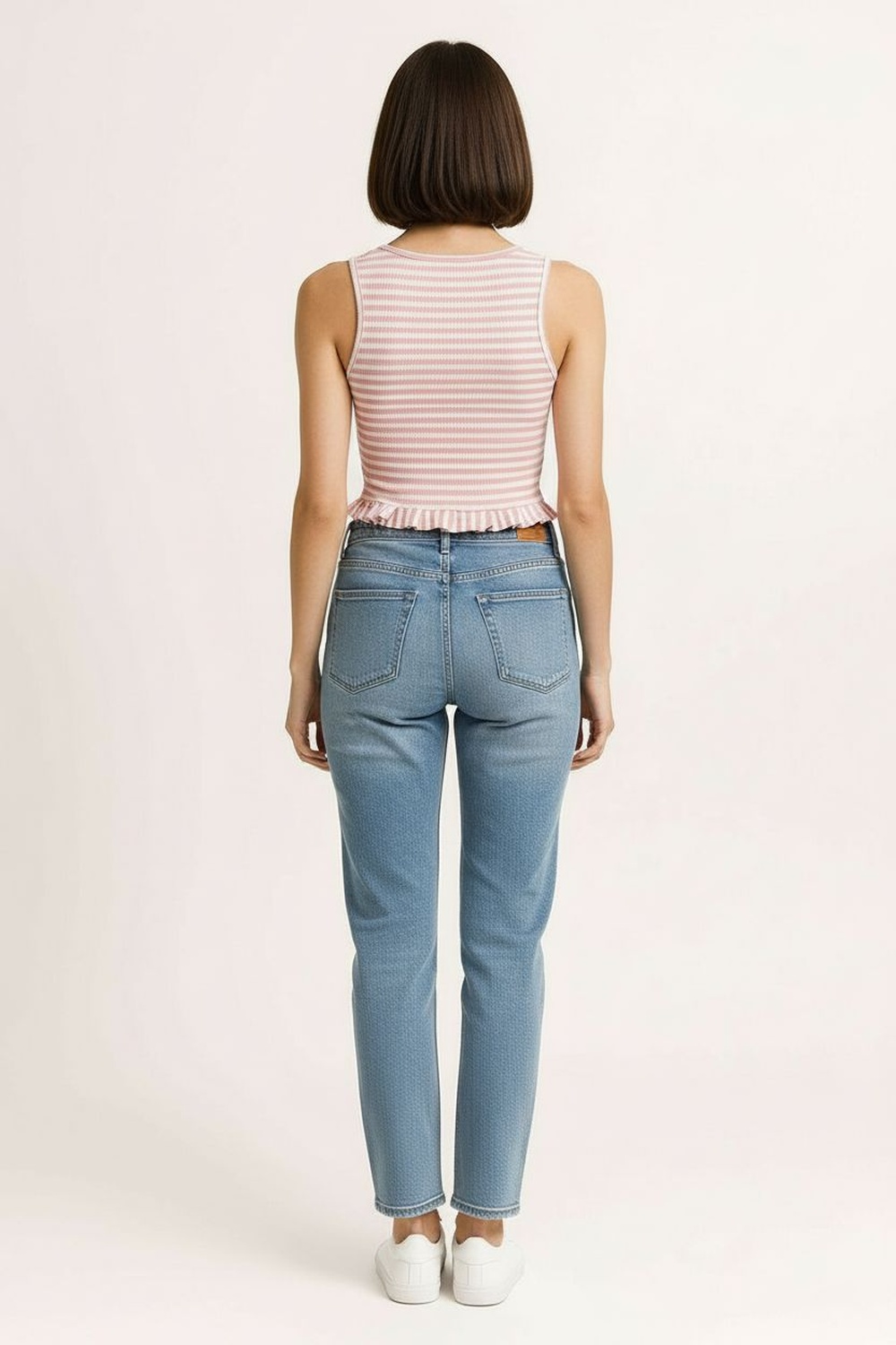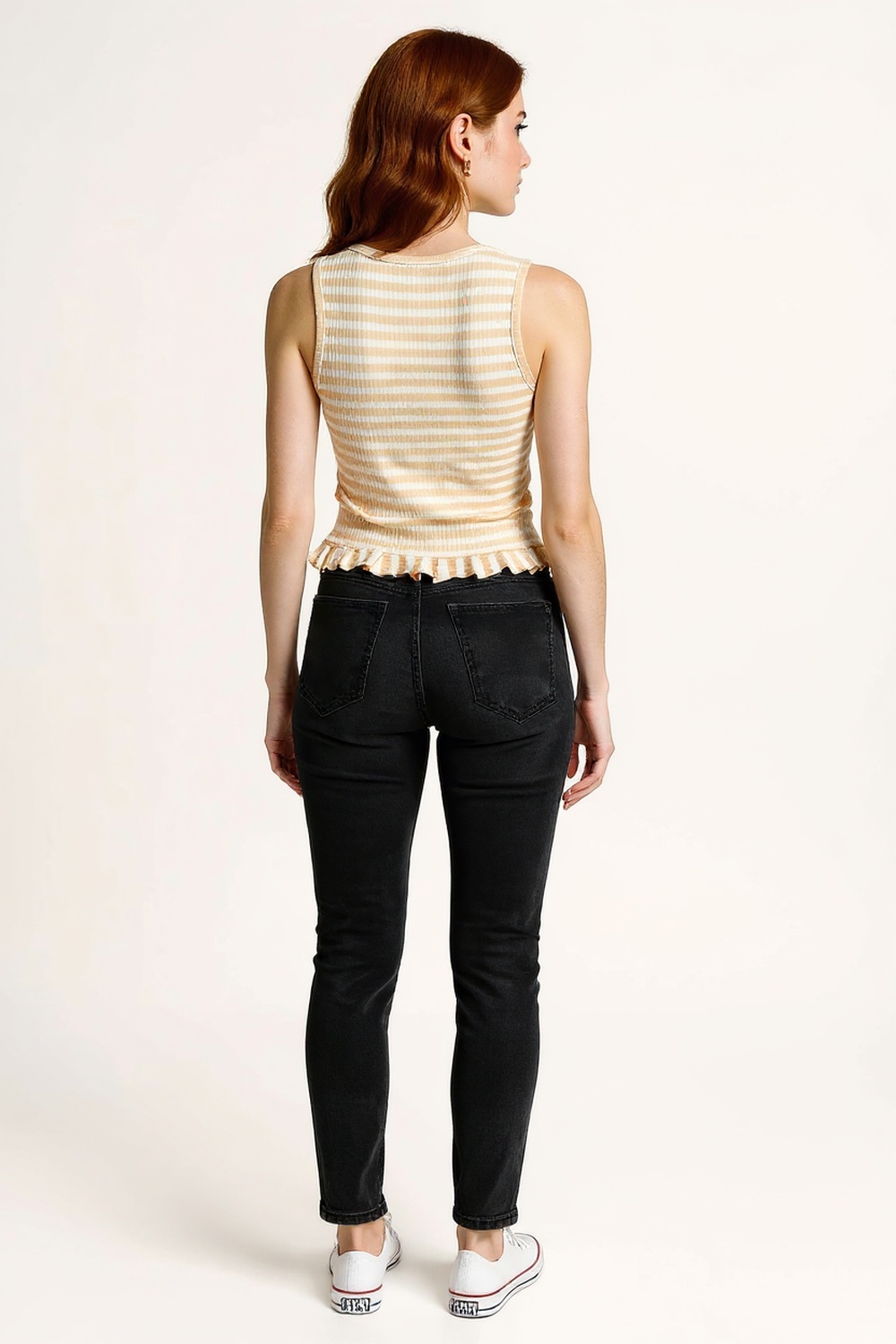Playera de tejido rib con tirantes anchos y escote redondo que brinda ajuste cómodo al torso, diseño ajustado que define la silueta, detalle de faldón en la parte inferior que aporta movimiento y efecto visual estilizado, confección elástica que permite libertad de movimiento, acabado suave al tacto para uso diario