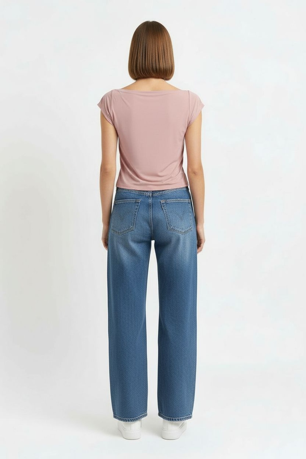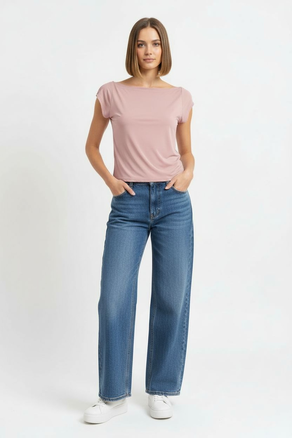 Playera con cuello amplio, manga corta, corte ajustado, confección ligera, acabado suave, estructura flexible que se adapta al cuerpo