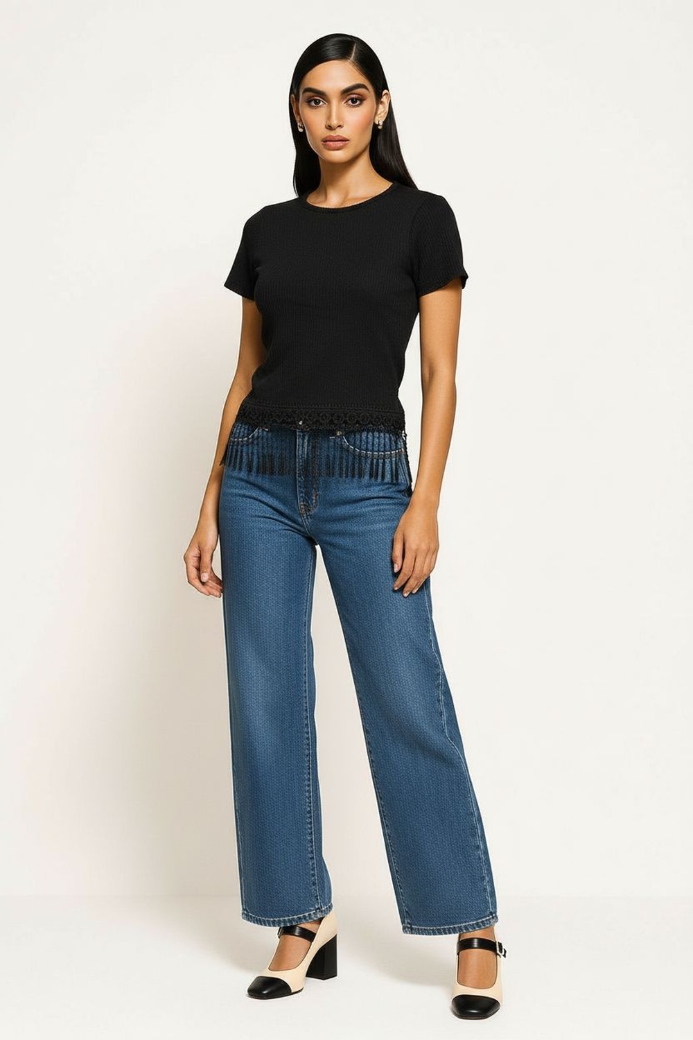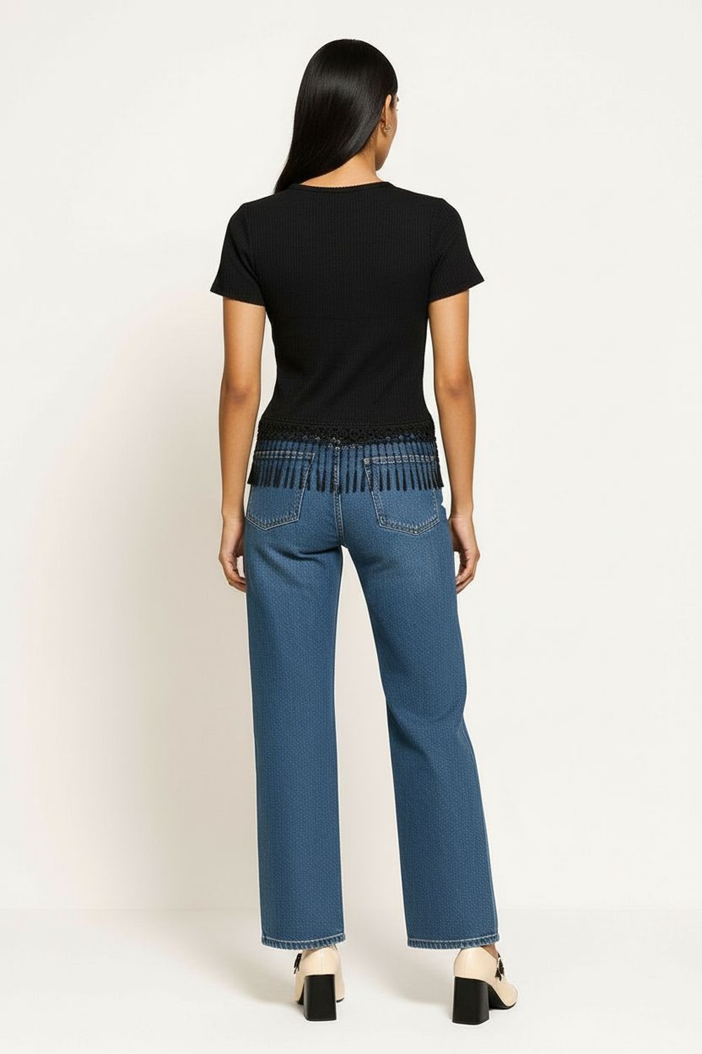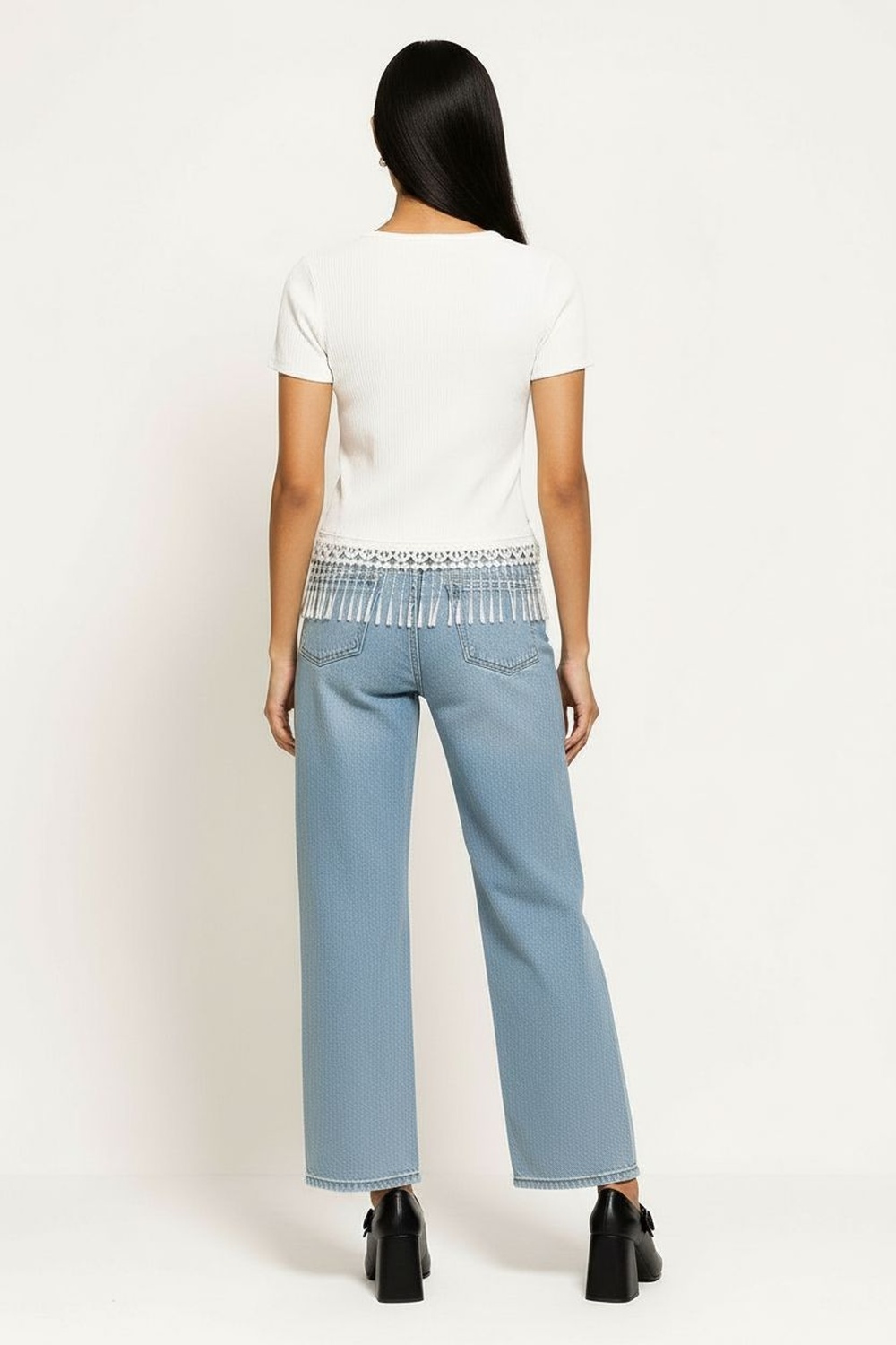 Playera de manga corta con cuello redondo de terminación limpia, ruedo con aplicación textil que aporta detalle visual y movimiento, corte recto que se adapta con facilidad, confección suave que brinda comodidad durante el uso, largo regular que equilibra la silueta