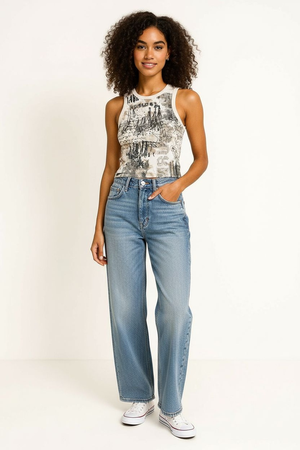 Playera sin manga con cuello redondo, ajuste al cuerpo, largo a la cintura, frente con gráfico aplicado, tejido suave al tacto