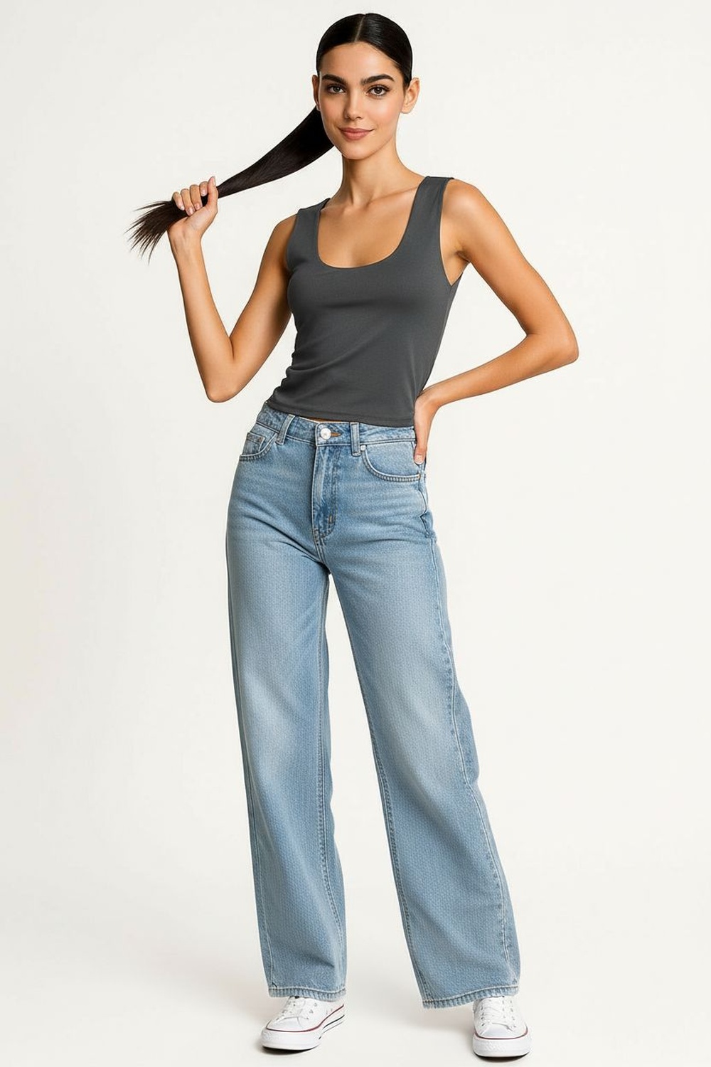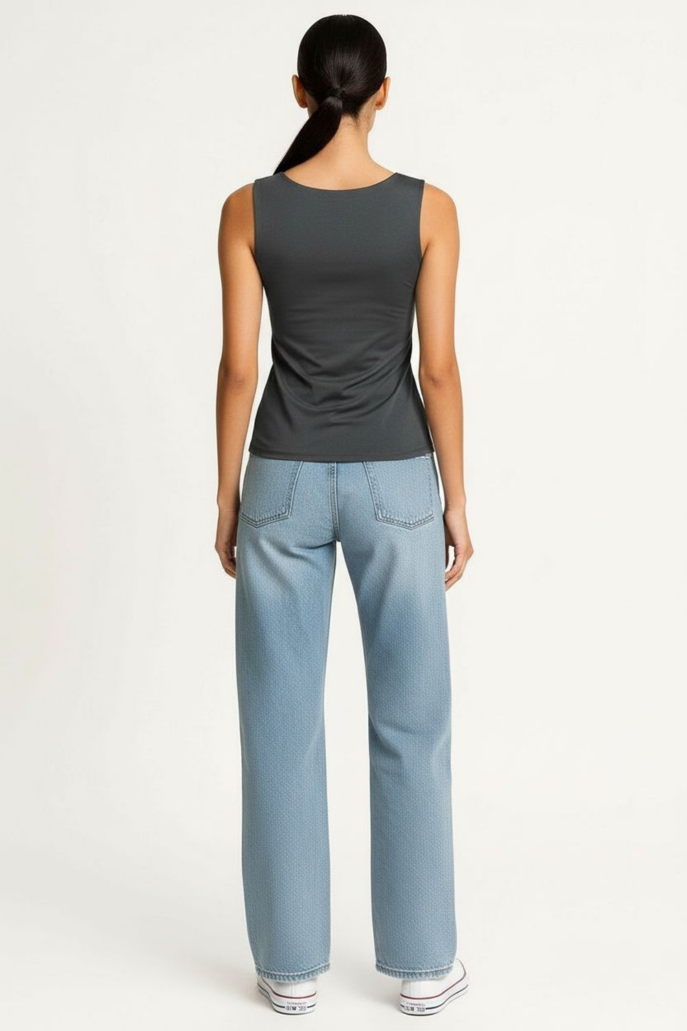 Playera sin manga con escote amplio y tirantes anchos, diseño ajustado al cuerpo y terminación recta