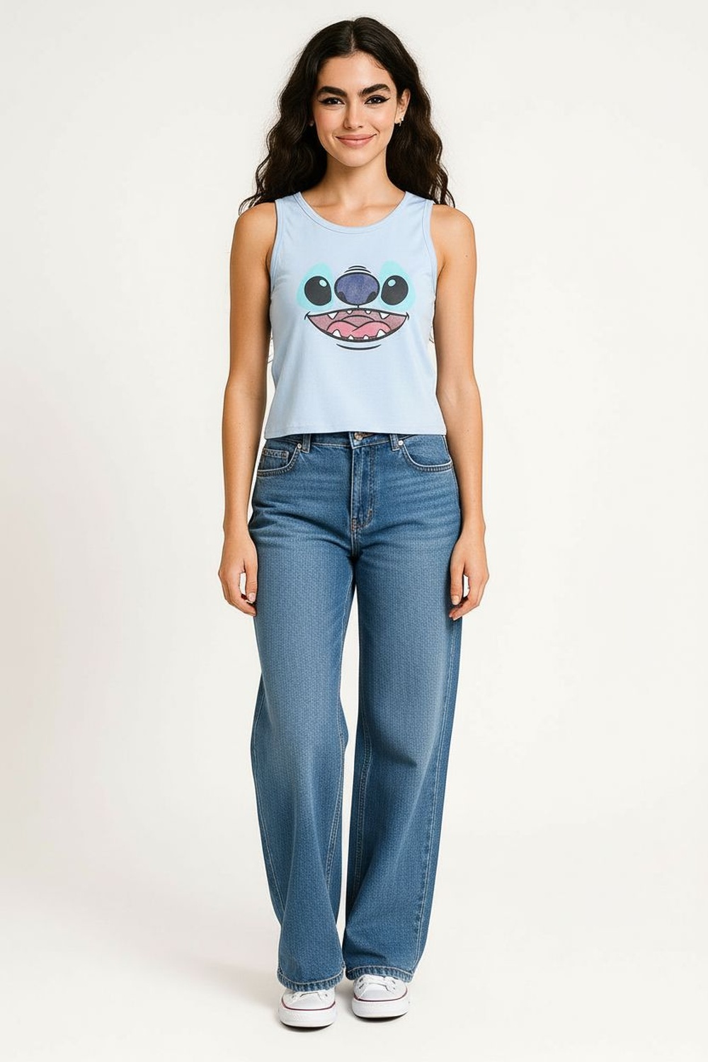 Playera sin mangas con cuello redondo, estampa frontal decorativa, ajuste al cuerpo, terminación recta