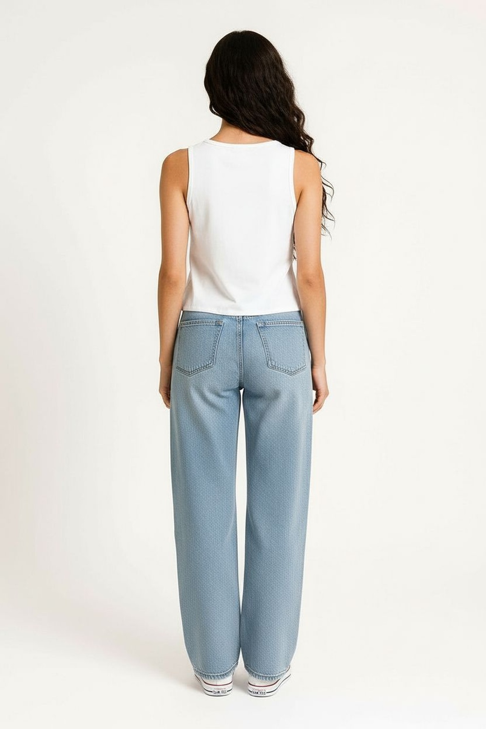 Jeans tiro medio con pretina estructurada, cierre frontal con botones, bolsillos delanteros y traseros, corte ajustado a la pierna