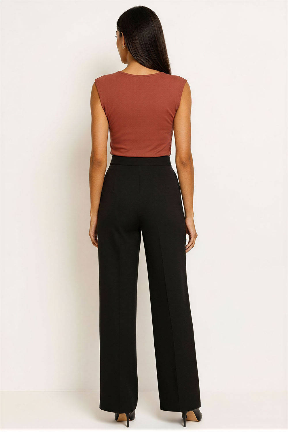Falda midi de corte recto con diseño estructurado que estiliza la silueta, pretina con trabillas que permite mejor ajuste, detalle de cadena decorativa al frente que aporta un acabado distintivo, confección en tejido firme que brinda caída uniforme y apariencia pulida, largo debajo de rodilla que ofrece versatilidad en uso diario