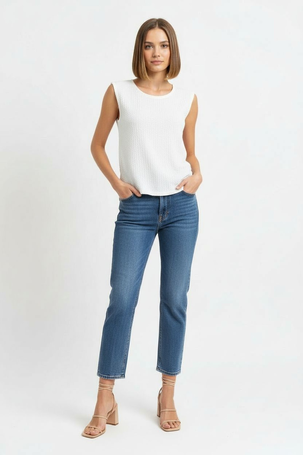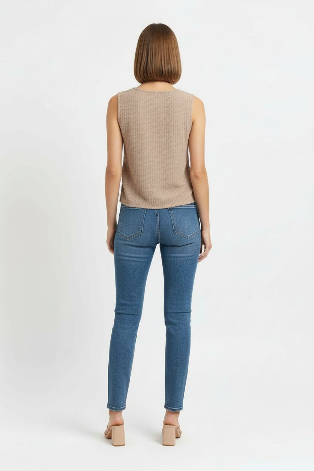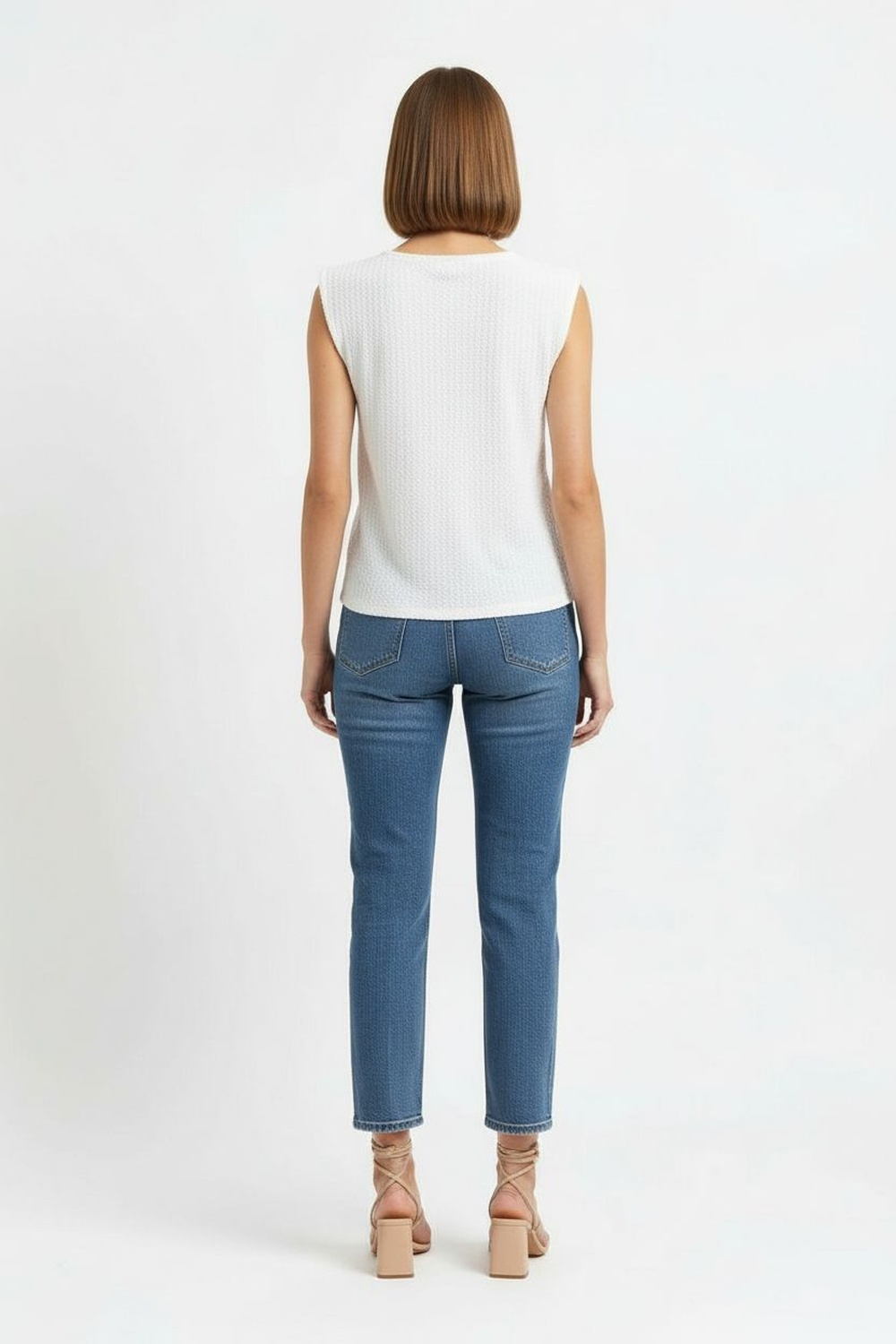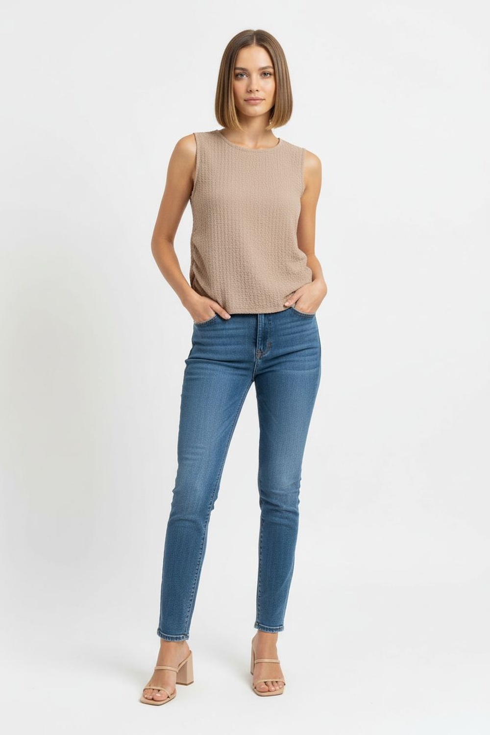 Blusa sin mangas con cuello redondo, corte superior ajustado, faldón amplio, caída ligera, ajuste cómodo en cuerpo