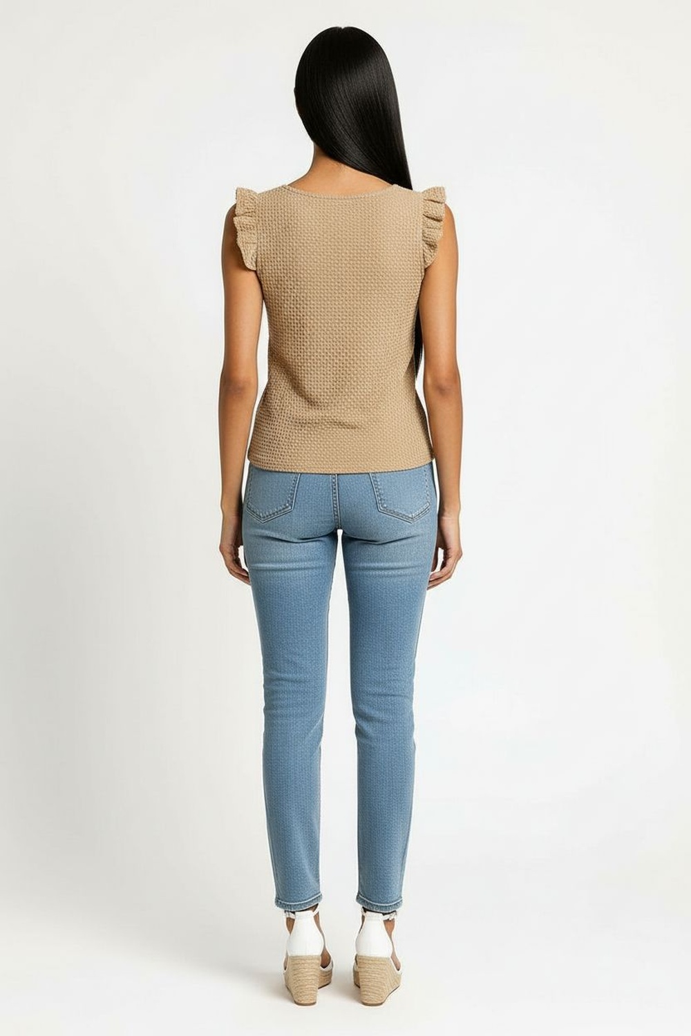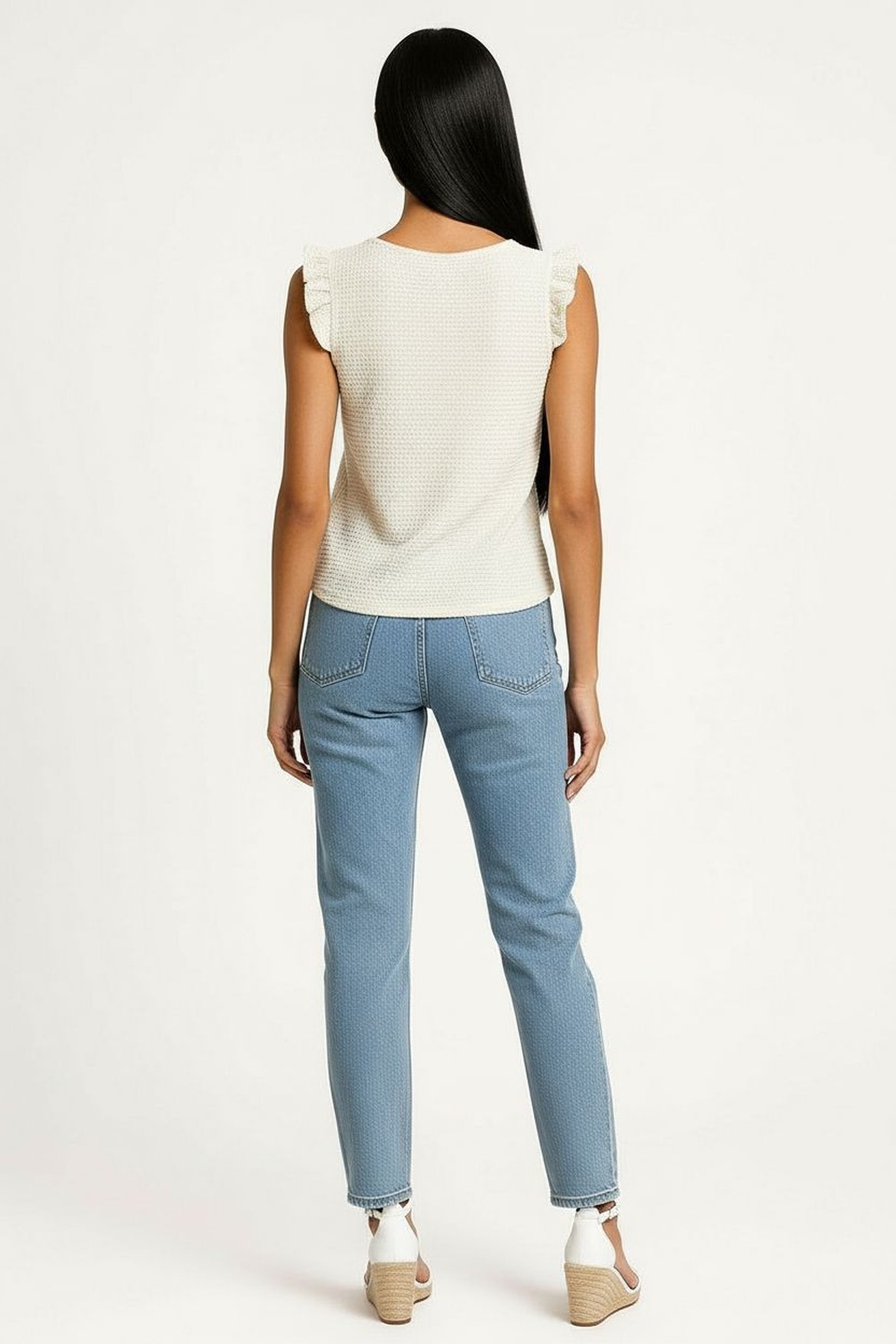 Playera sin mangas de corte recto con largo a la cadera, escote redondo cerrado que aporta equilibrio visual, detalle de olan ligero en hombros que añade dimensión, confección en tejido con textura suave que brinda comodidad y frescura, estructura ligera que se adapta al cuerpo con caída natural