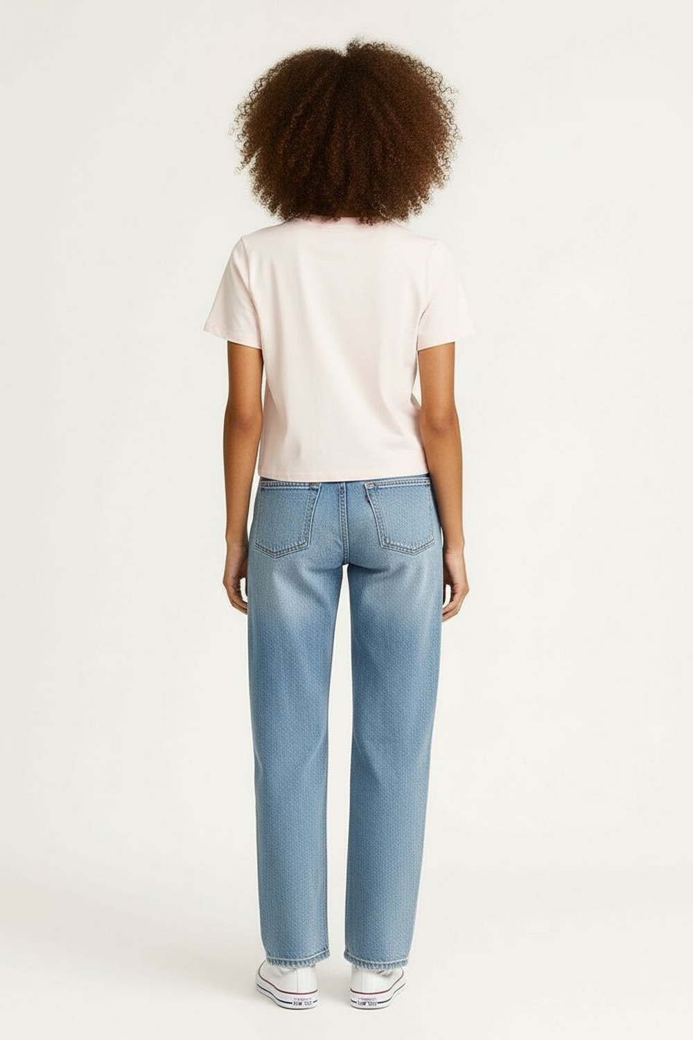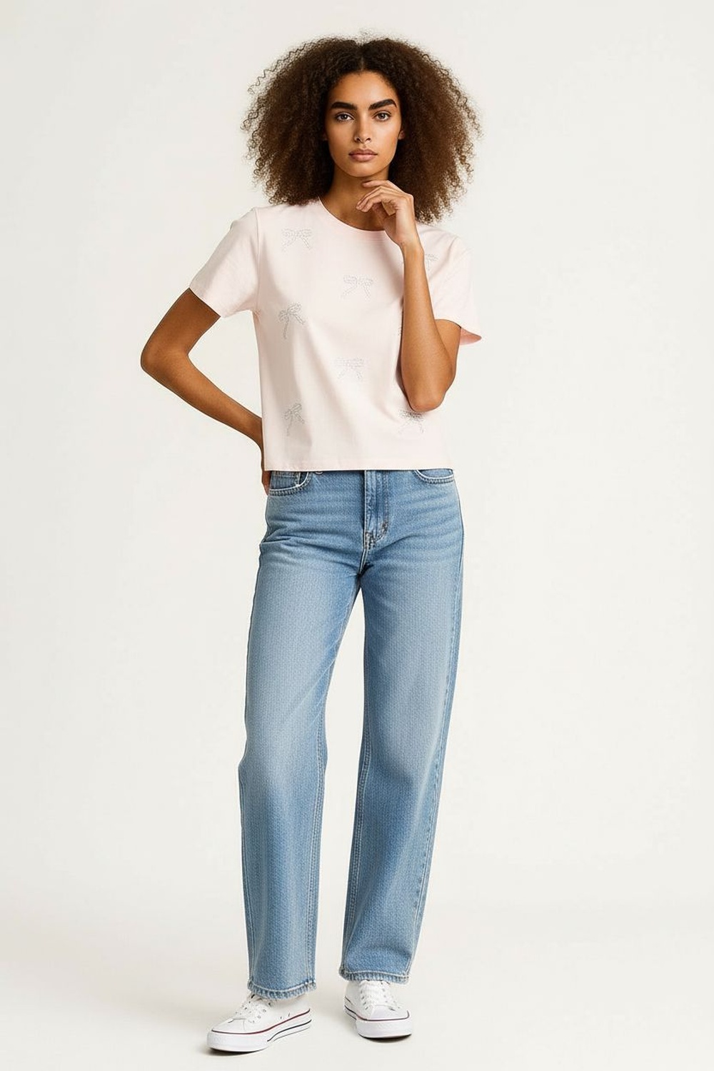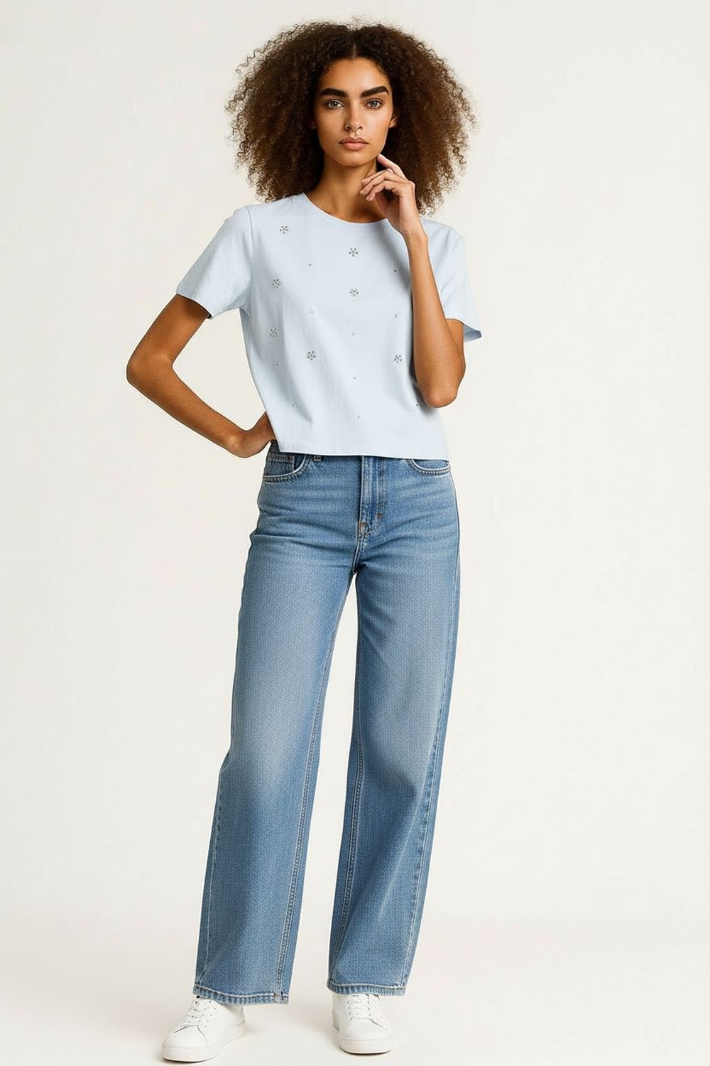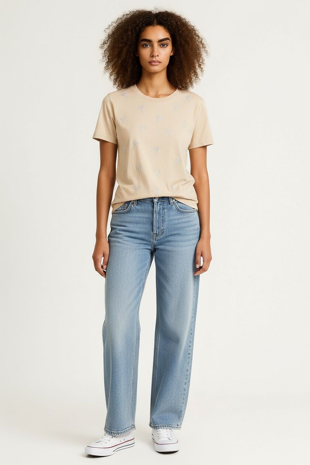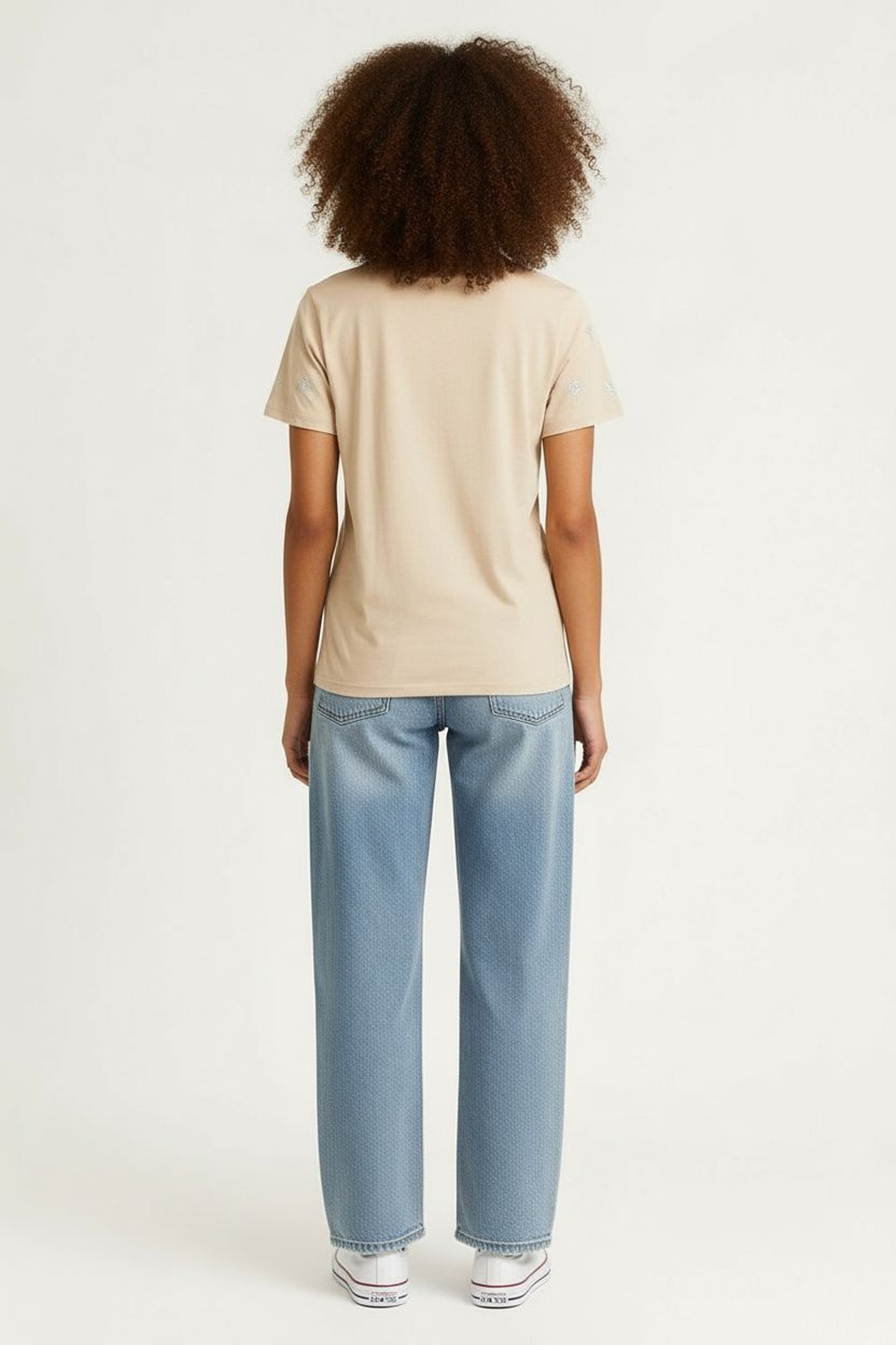 Playera de manga corta con cuello redondo, ajuste suelto y caída ligera, detalle de aplicaciones decorativas al frente, confección suave de uso diario