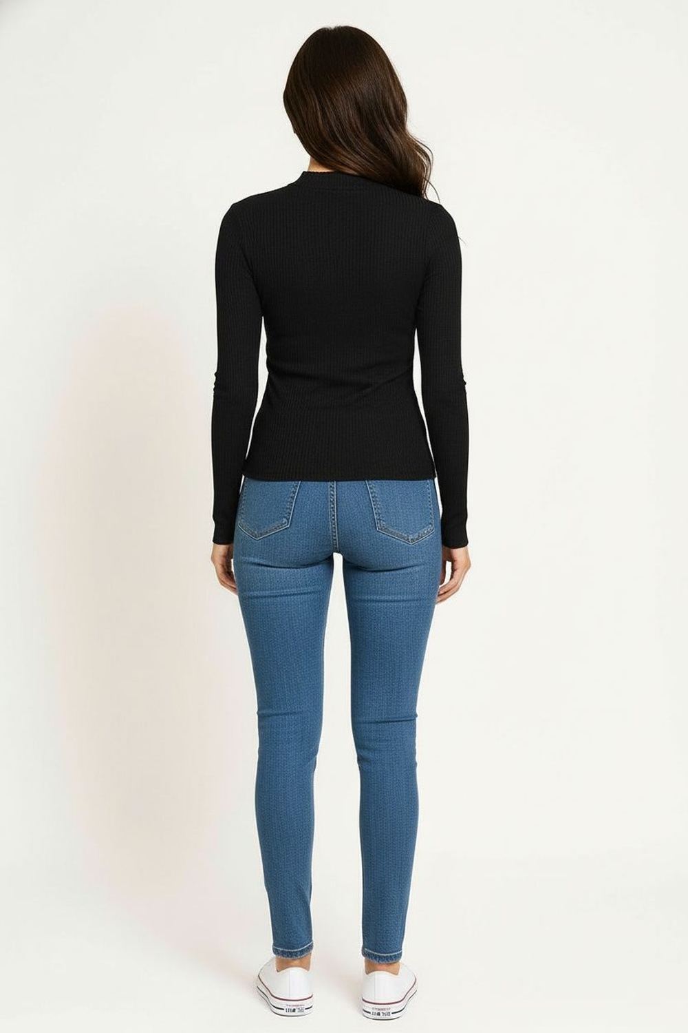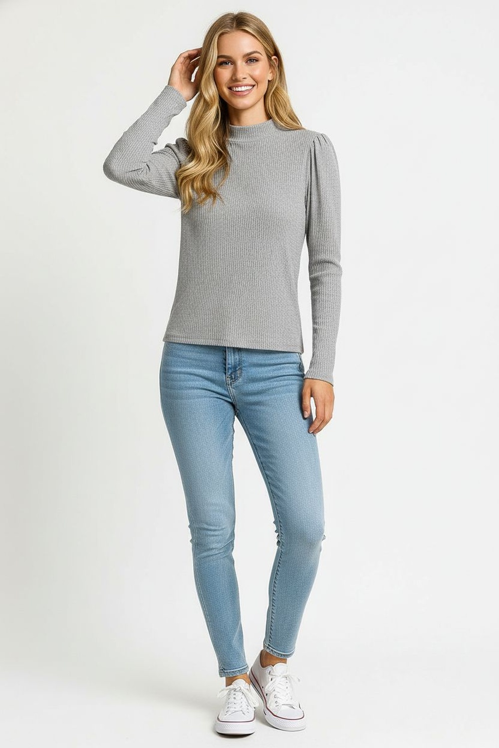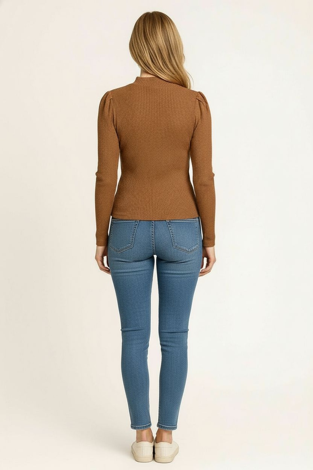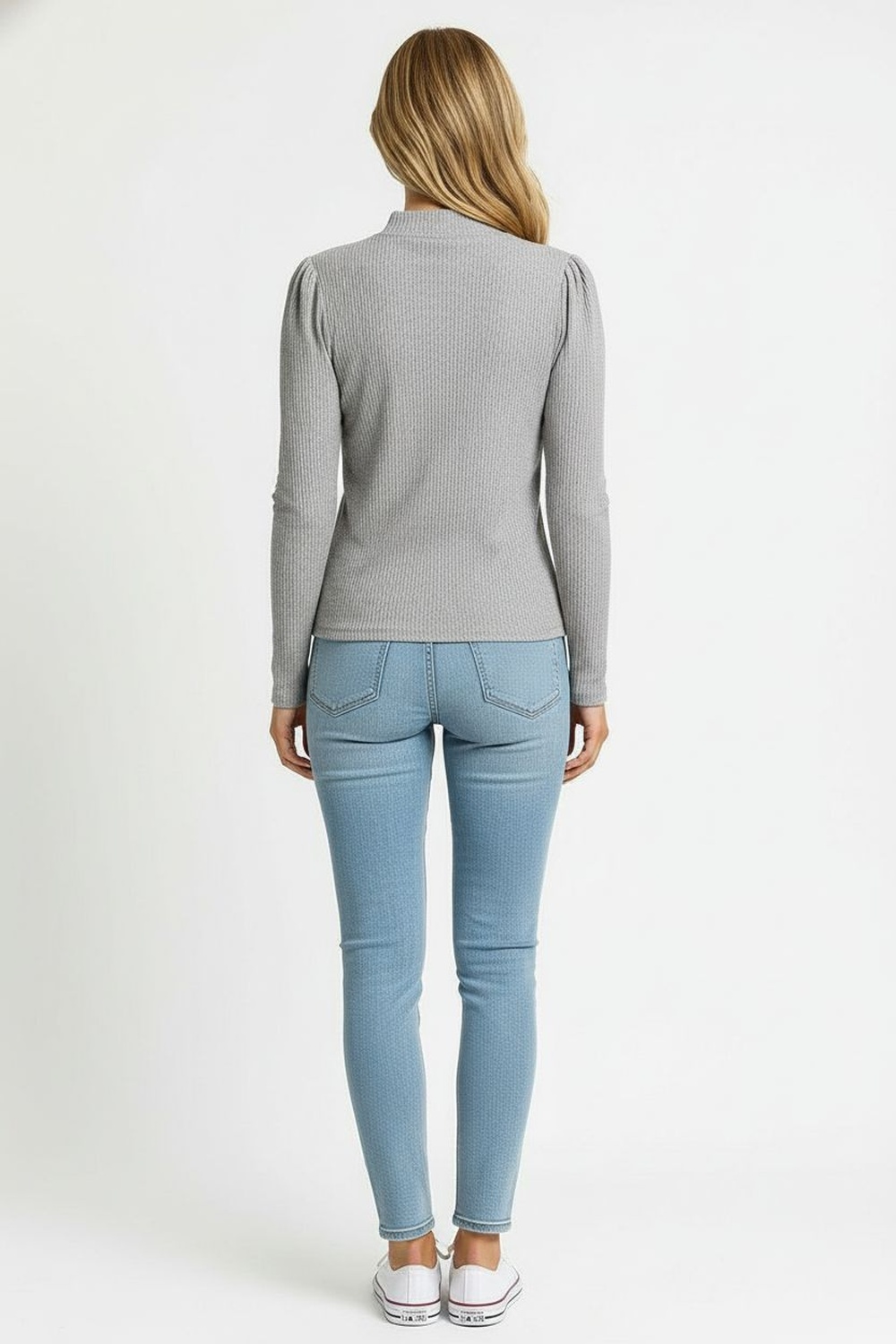 Playera de manga larga confeccionada en tejido tipo chenille de textura suave, cuello alto que aporta calidez y estilo, hombros ligeramente estructurados que realzan la silueta, ajuste al cuerpo que brinda comodidad y acabado brillante que eleva el diseño