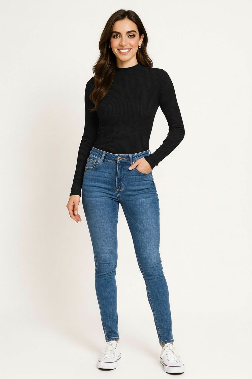 Pantalón de mezclilla con estructura tradicional de cinco bolsillos, corte recto que estiliza la figura, costuras firmes y pretina anatómica con cierre metálico, confección en mezclilla elástica que proporciona ajuste cómodo