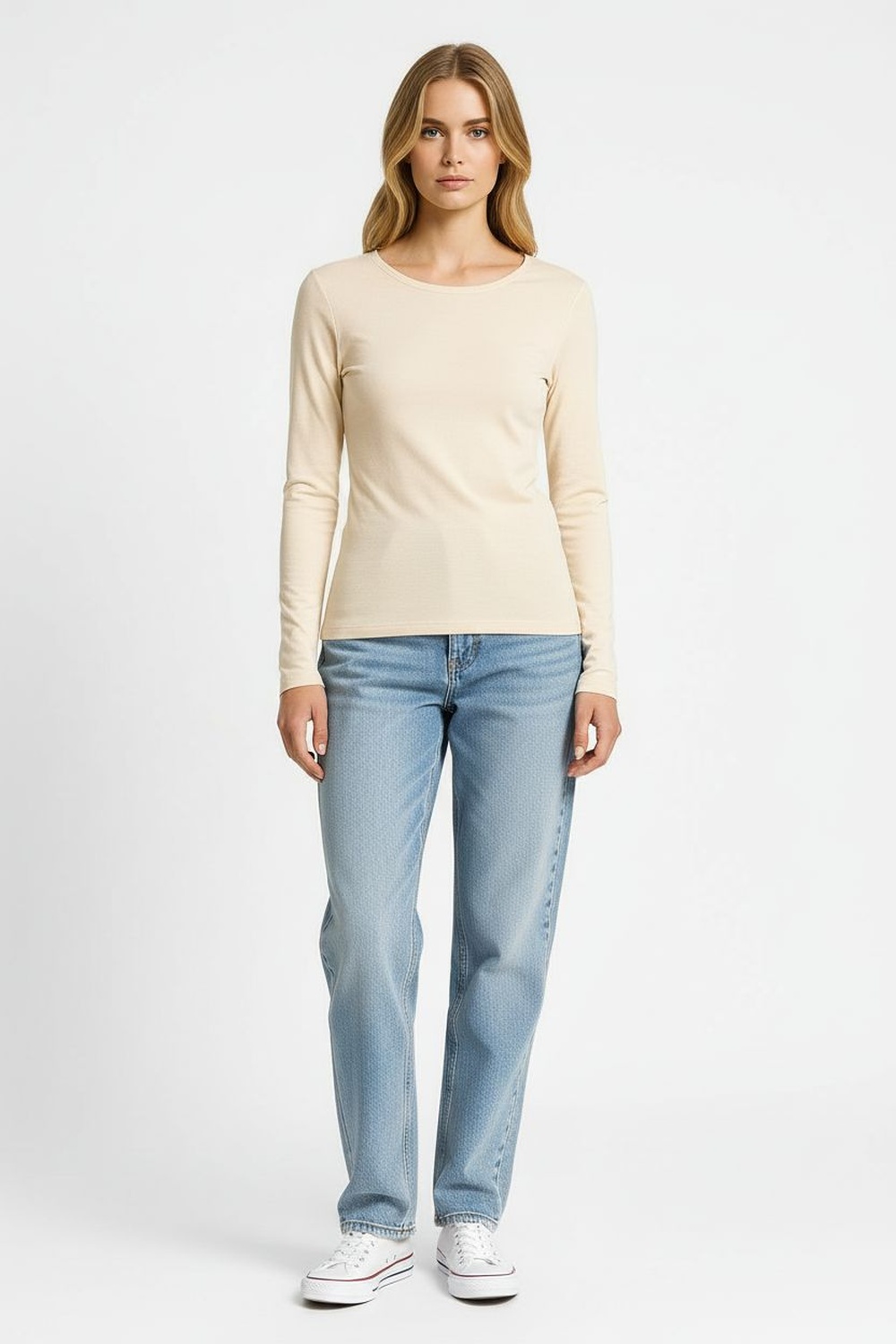 Playera térmica de manga larga confeccionada en tejido suave y elástico que conserva el calor corporal, cuello redondo clásico, costuras planas que evitan roces, diseño ajustado que se adapta al cuerpo sin limitar el movimiento