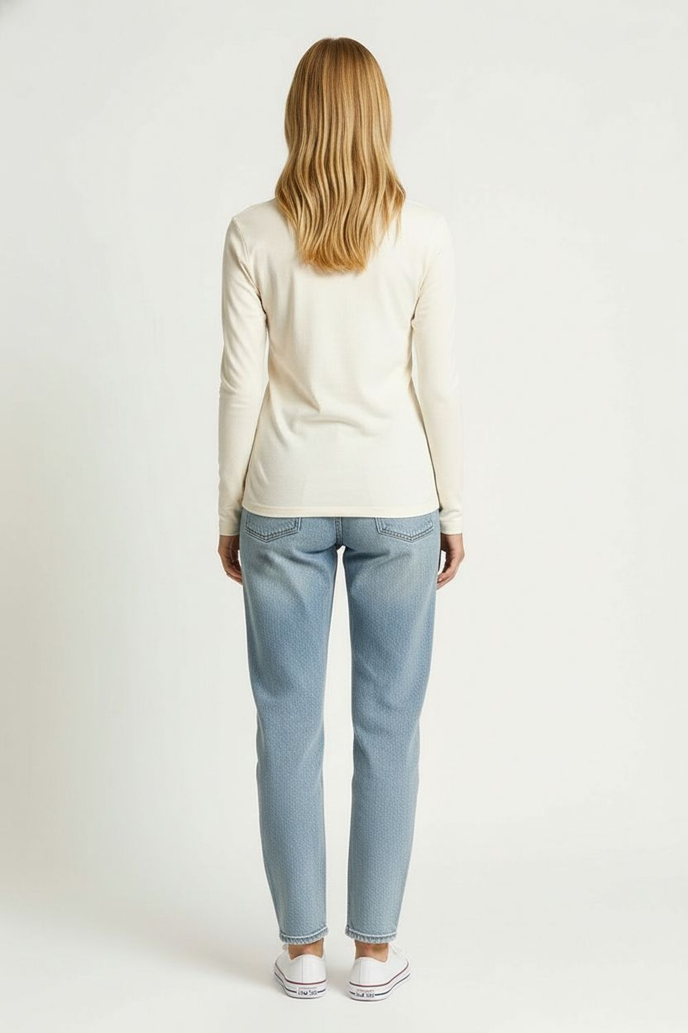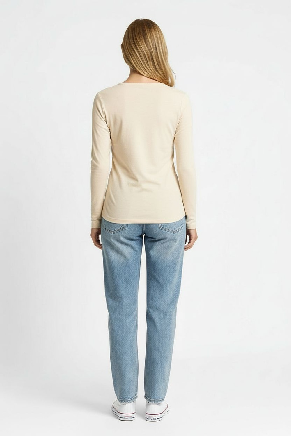 Playera de manga larga con escote redondo que realza el cuello, detalle de botones al frente que añade un toque moderno y casual, corte ajustado que define la silueta y resalta la figura, confección en tejido acanalado de textura suave que ofrece elasticidad y confort, prenda esencial para crear looks cómodos y con estilo en cualquier temporada