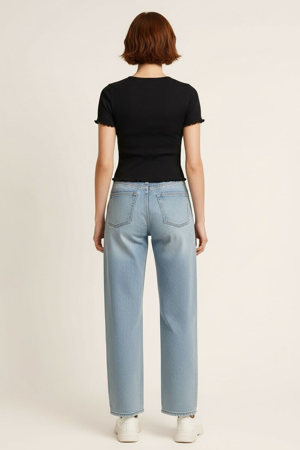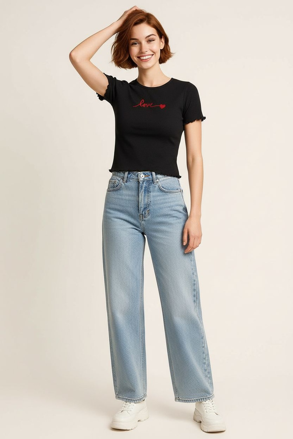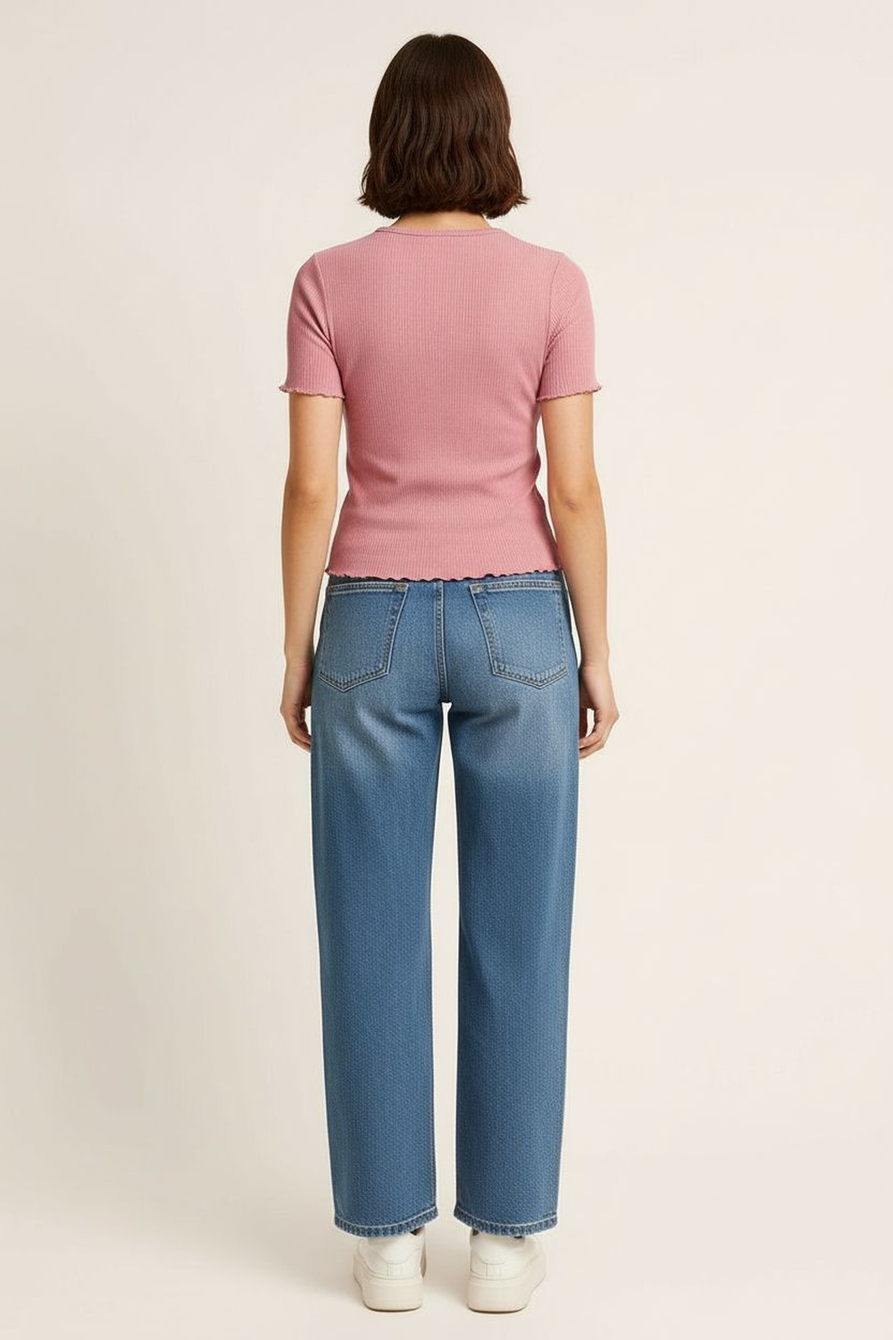 Playera de manga corta con cuello redondo de terminación limpia, ruedo con aplicación textil que aporta detalle visual y movimiento, corte recto que se adapta con facilidad, confección suave que brinda comodidad durante el uso, largo regular que equilibra la silueta