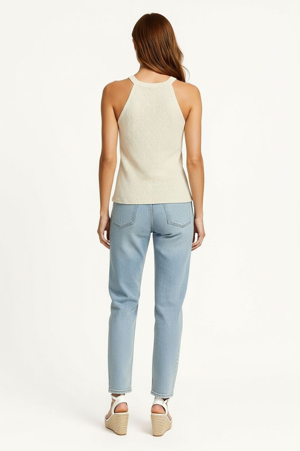 Blusa sin mangas cuello redondo estructura recta caída ligera abertura lateral terminación limpia confección cómoda para uso diario