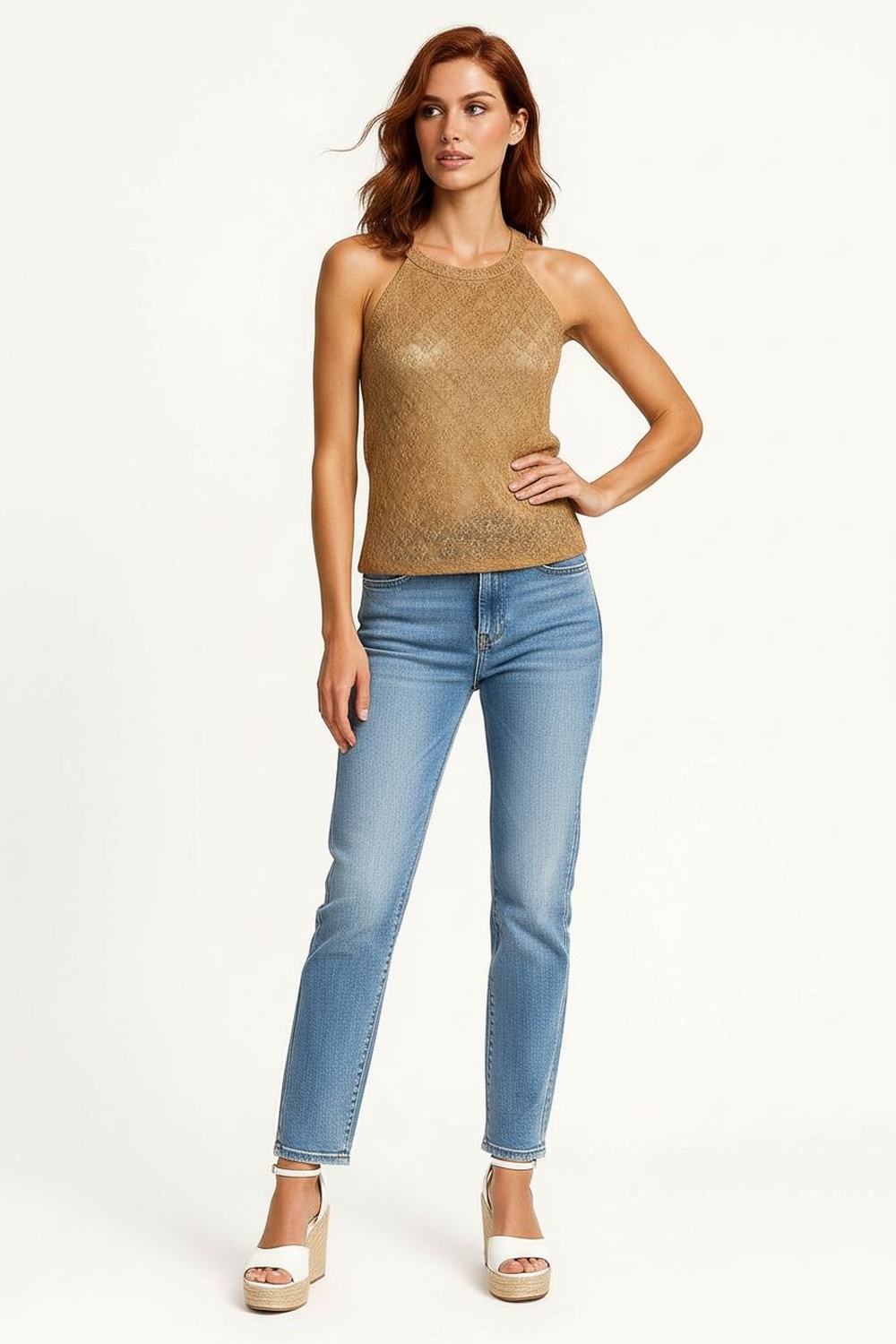 Top con tirantes anchos, escote redondo, estructura ajustada en cuerpo, tejido seamless con textura ligera, largo corto a la cintura