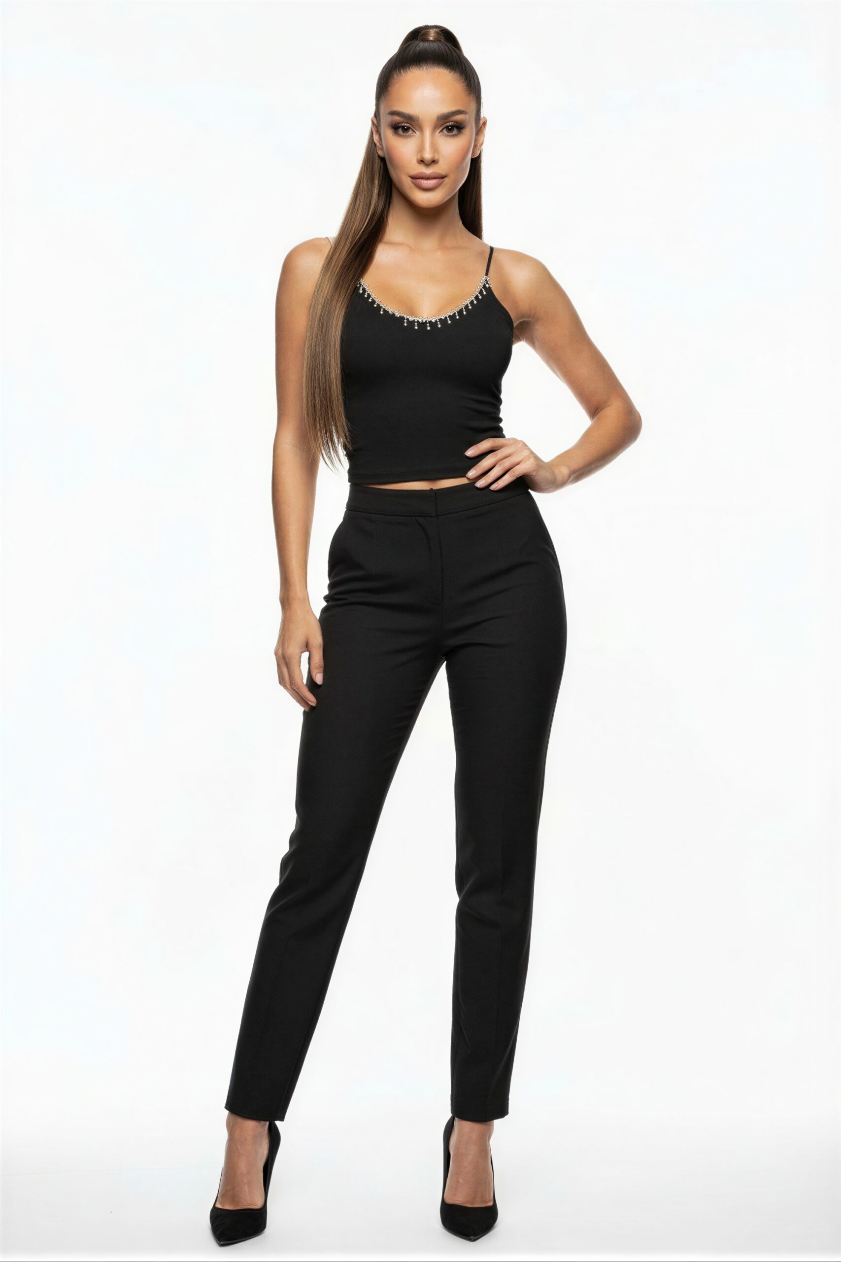 Playera de tirantes delgados, escote redondo con aplicación decorativa, ajuste al cuerpo, tela ligera de tacto suave, terminación recta
