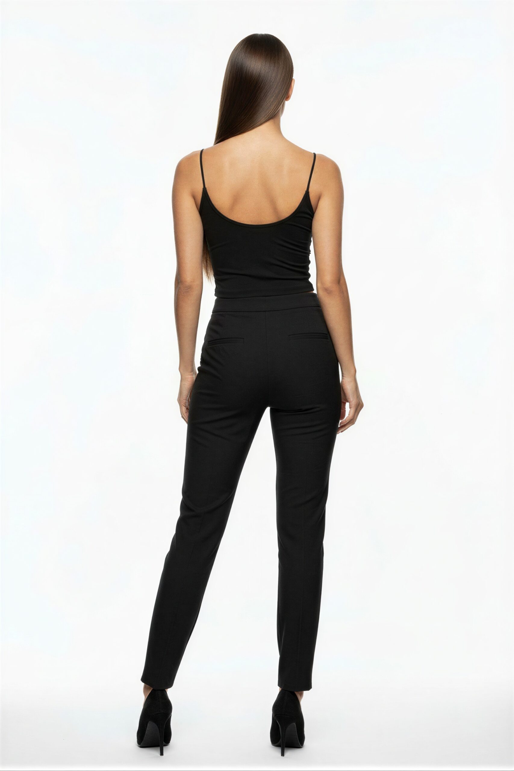 Playera sin mangas con cuello alto y diseño asimétrico con abertura frontal discreta, drapeado lateral que aporta textura y definición a la silueta, confección en tela elástica de tacto suave que se adapta al cuerpo, largo a la cadera que brinda ajuste cómodo y estructura estilizada