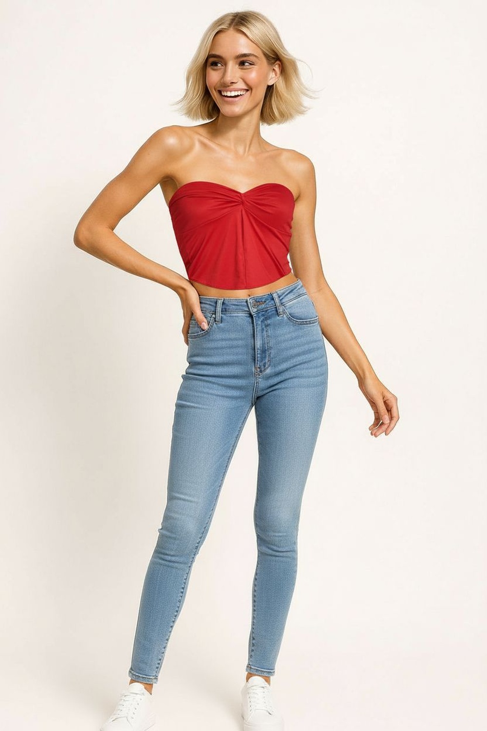 Top tipo banda con anudado frontal que genera ajuste personalizado, escote recto con abertura central discreta, confección en tejido suave de tacto ligero, corte corto con caída fluida, estructura sin mangas que brinda libertad de movimiento