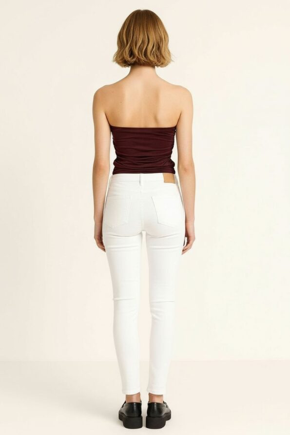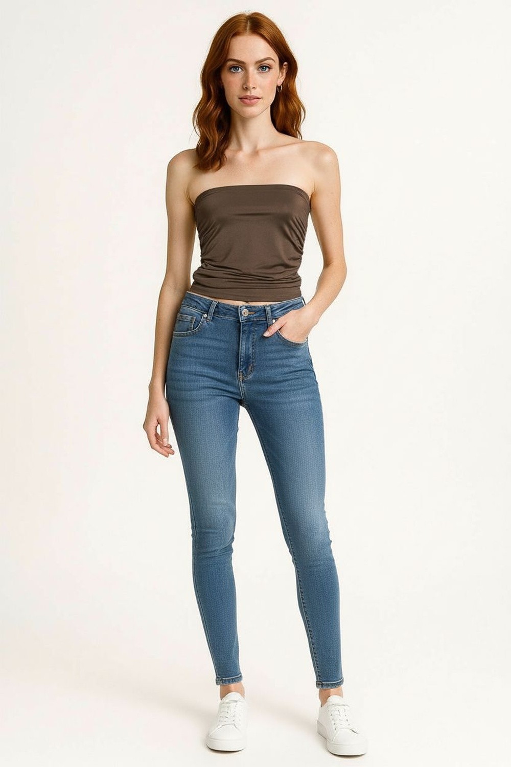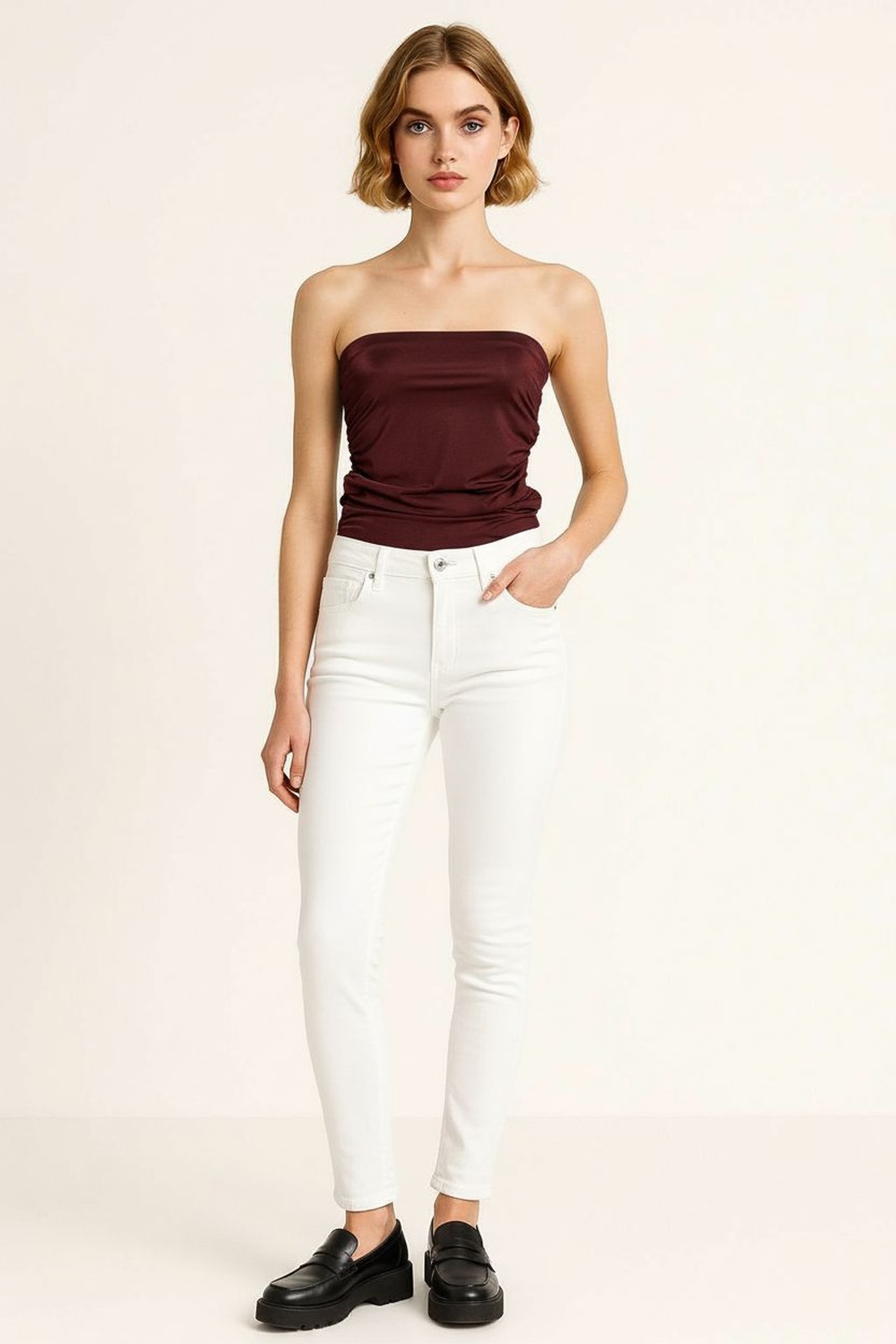 Playera top tipo banda con detalle drapeado en los costados que aporta textura y realza la figura, diseño strapless que deja los hombros descubiertos ofreciendo un look moderno y atractivo, pretina elástica superior que asegura ajuste firme y cómodo, largo a la cadera que favorece distintas siluetas, confección en tela elástica y suave que brinda comodidad y libertad de movimiento
