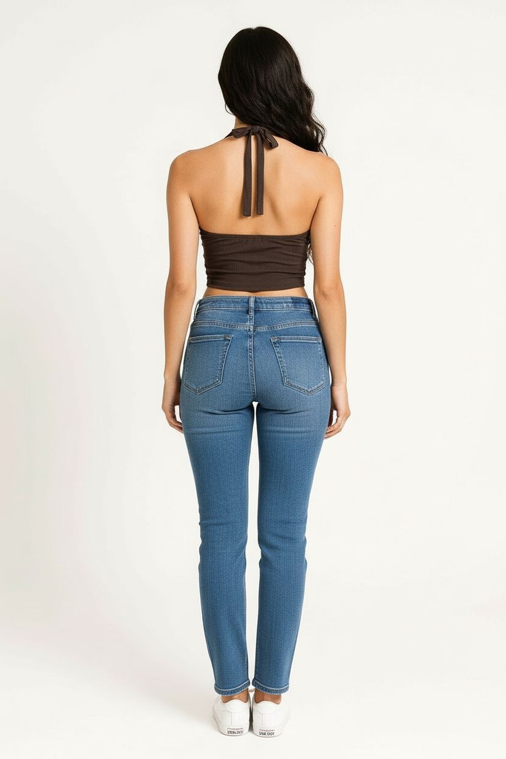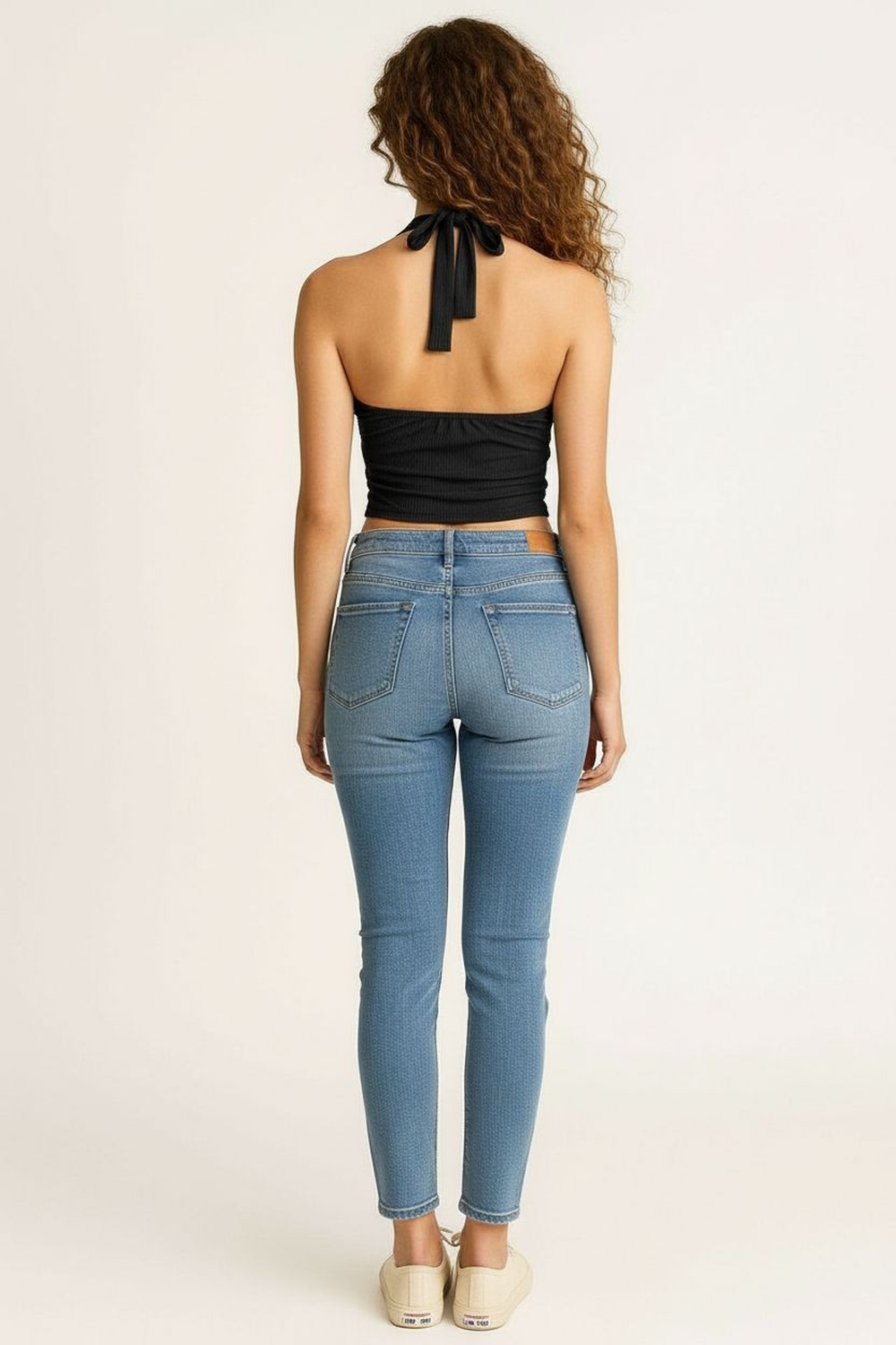 Top de corte halter con amarre en cuello que permite ajuste personalizado, escote profundo que define la parte superior, confección en tejido acanalado de gramaje medio que brinda soporte, largo a la cintura que mantiene equilibrio visual, espalda descubierta que aporta ligereza al diseño