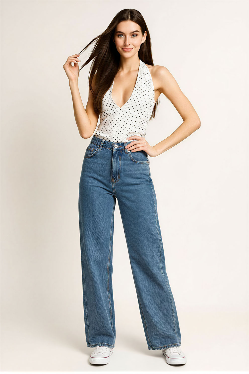 Jeans de mezclilla con tiro alto que define la cintura, corte amplio que brinda comodidad en pierna, diseño con pinzas y detalle de amarre en cintura que permite ajuste personalizado, bolsas funcionales que aportan practicidad, confección resistente que mantiene su estructura con el uso