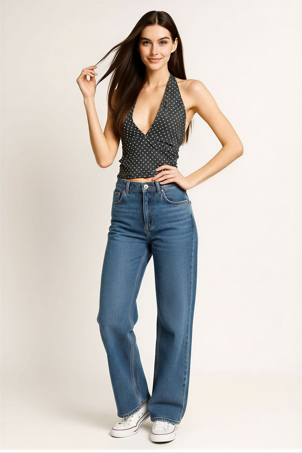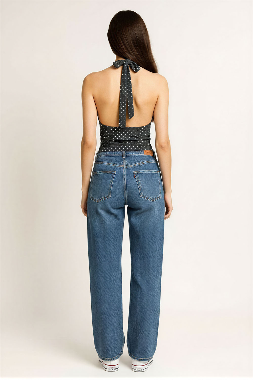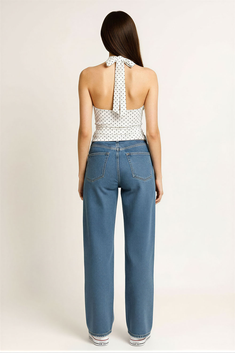 Top halter con escote profundo que estiliza la parte superior, tirantes que se anudan al cuello para ajuste personalizado, espalda descubierta que brinda frescura, diseño ajustado al torso que define la silueta, confección en tela ligera que permite comodidad durante el uso