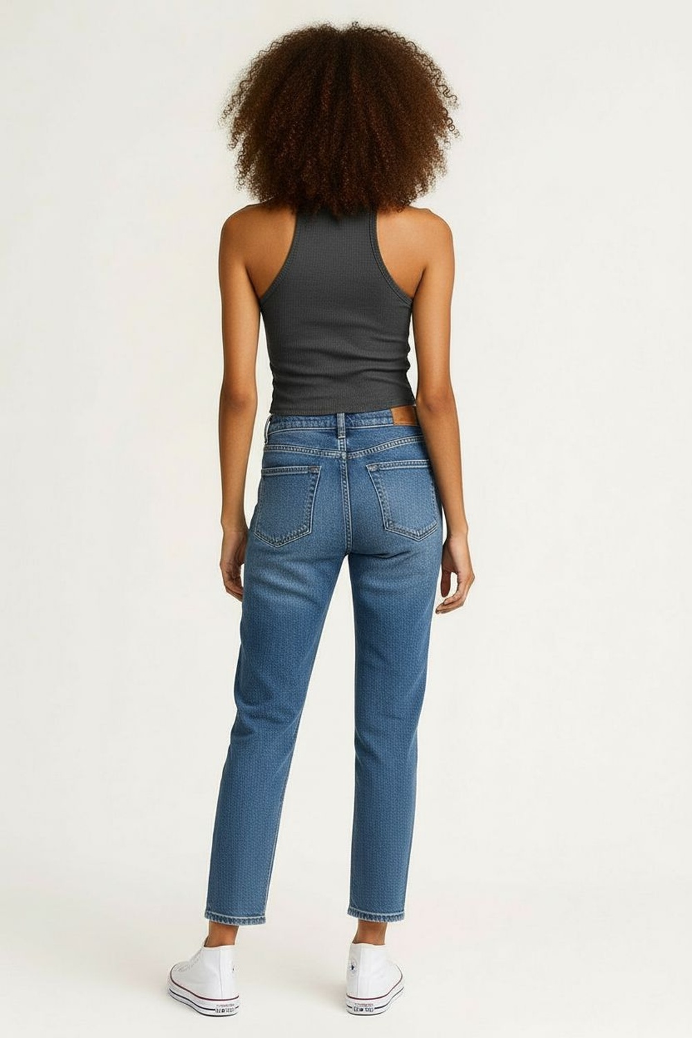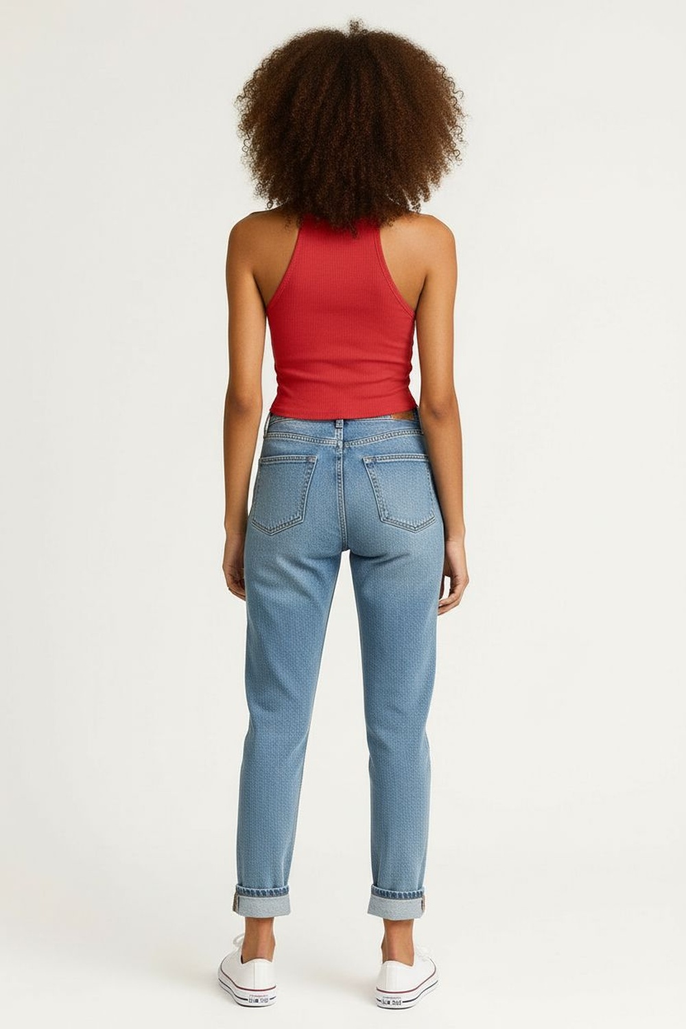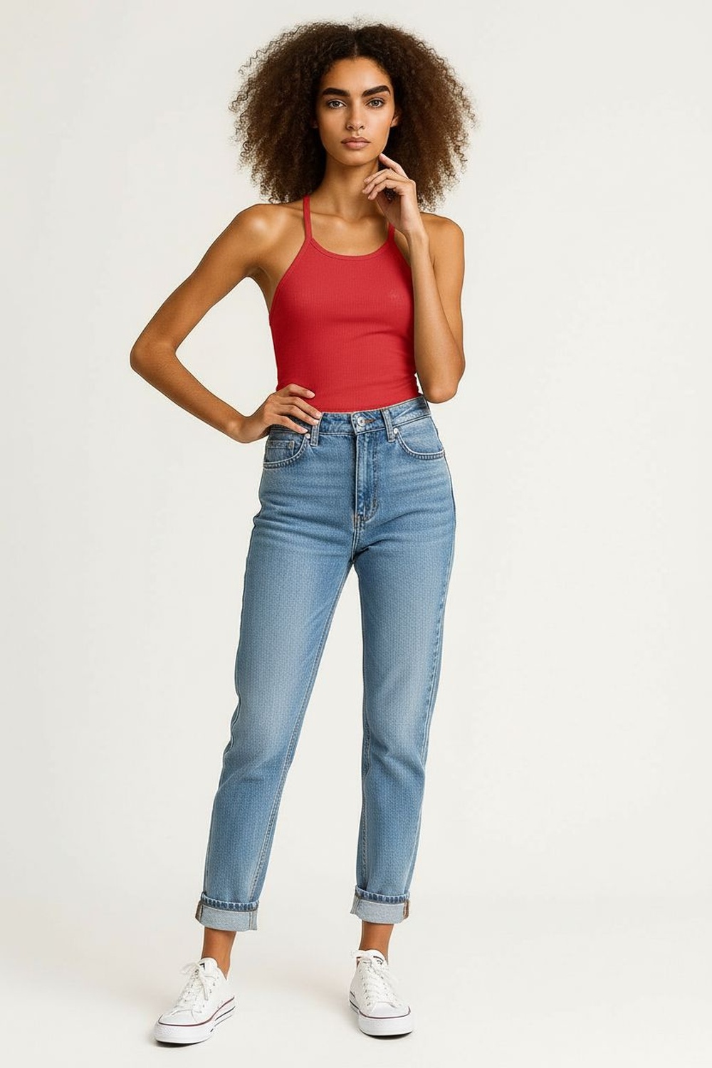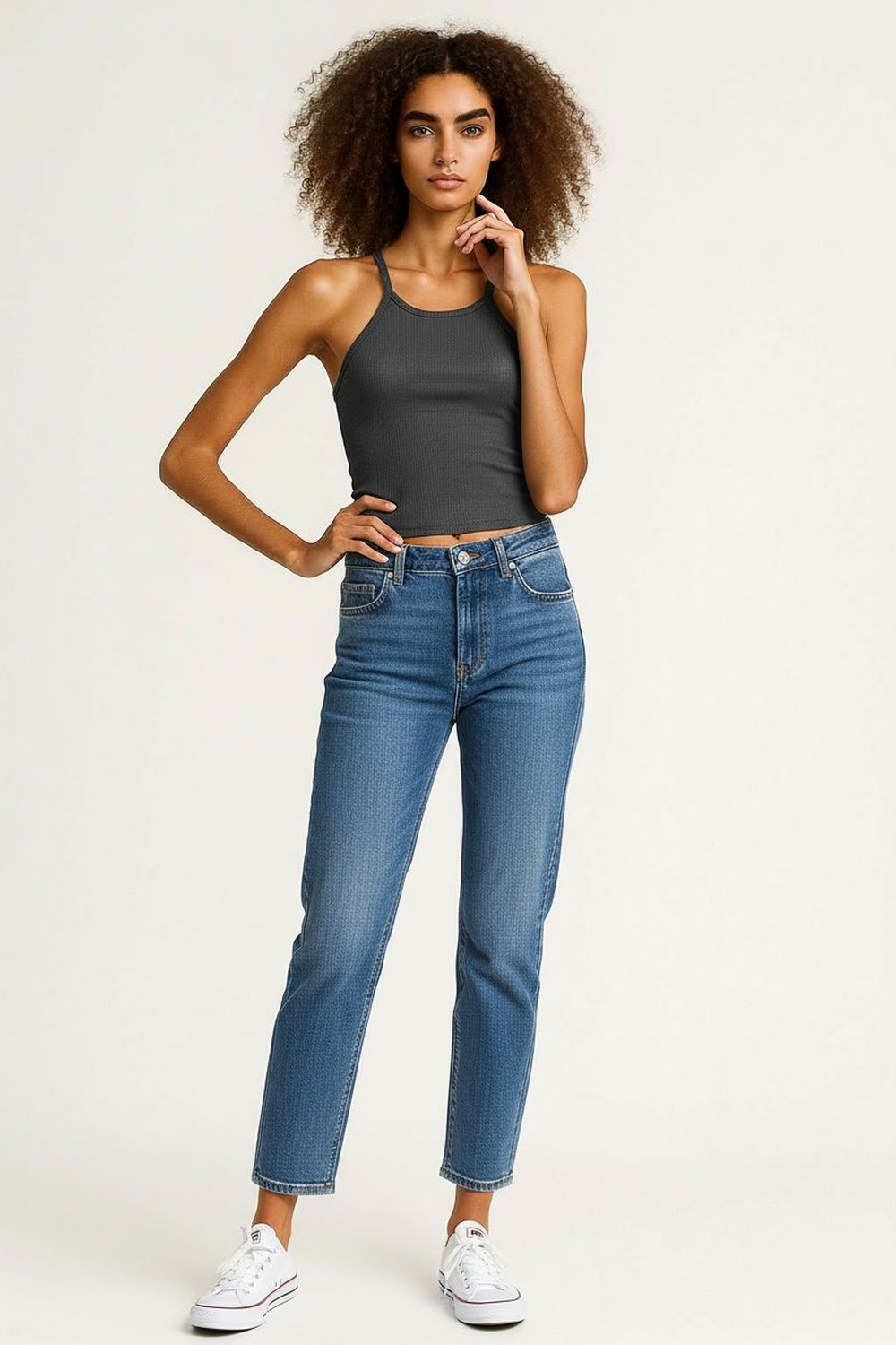 Top tipo halter con cuello alto y tirantes delgados, tejido acanalado y ajuste al cuerpo con corte a la cintura