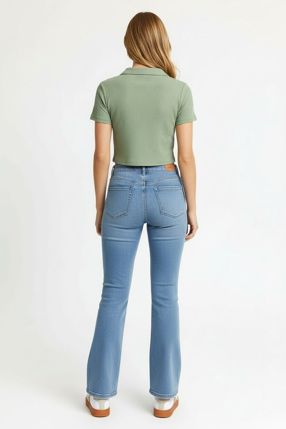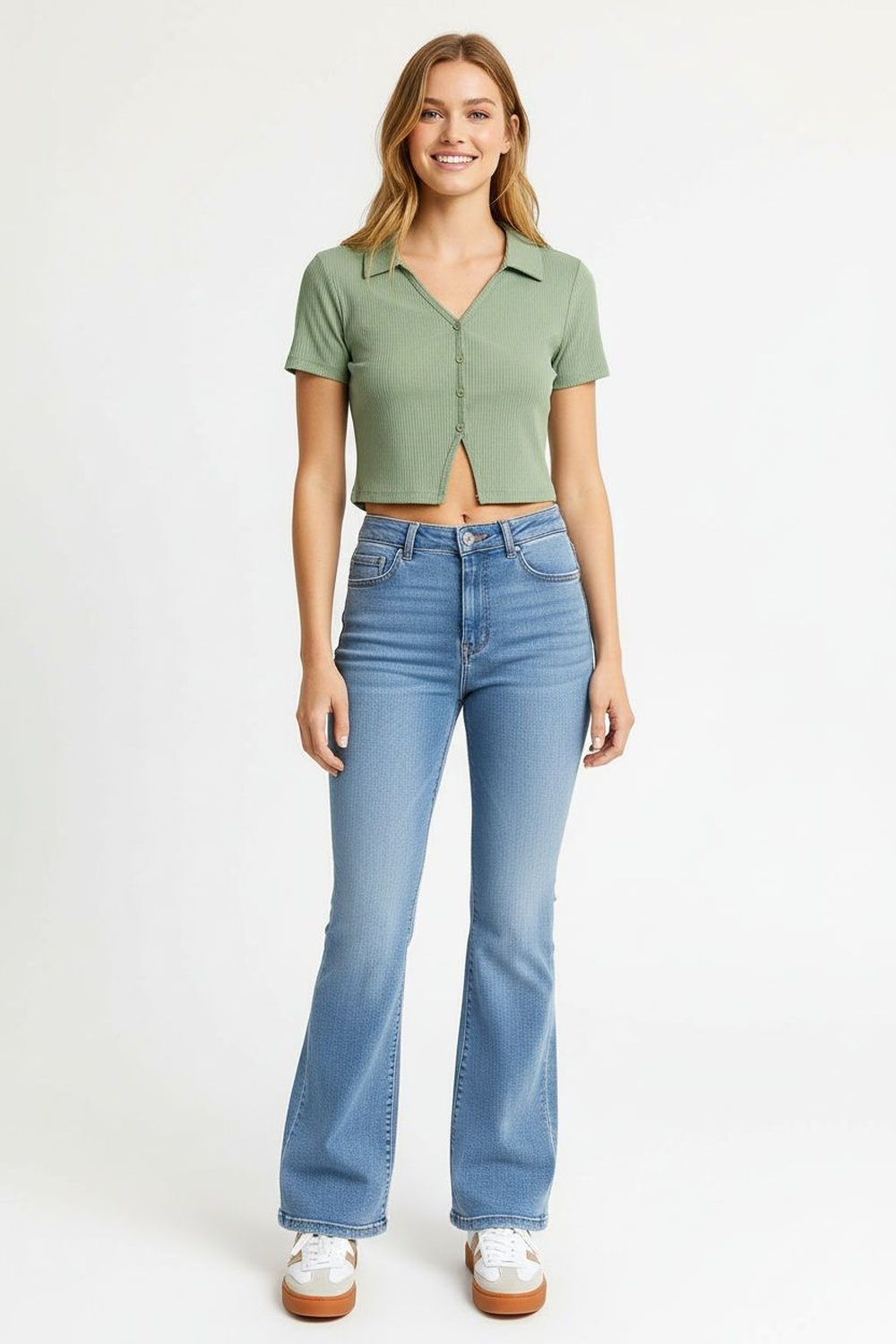 Playera de corte corto con cuello tipo sport que aporta estructura al escote, manga corta ajustada que permite libertad de movimiento, cierre frontal con botones funcionales que brindan detalle práctico, confección en tejido acanalado con elasticidad ligera y ajuste cómodo al cuerpo