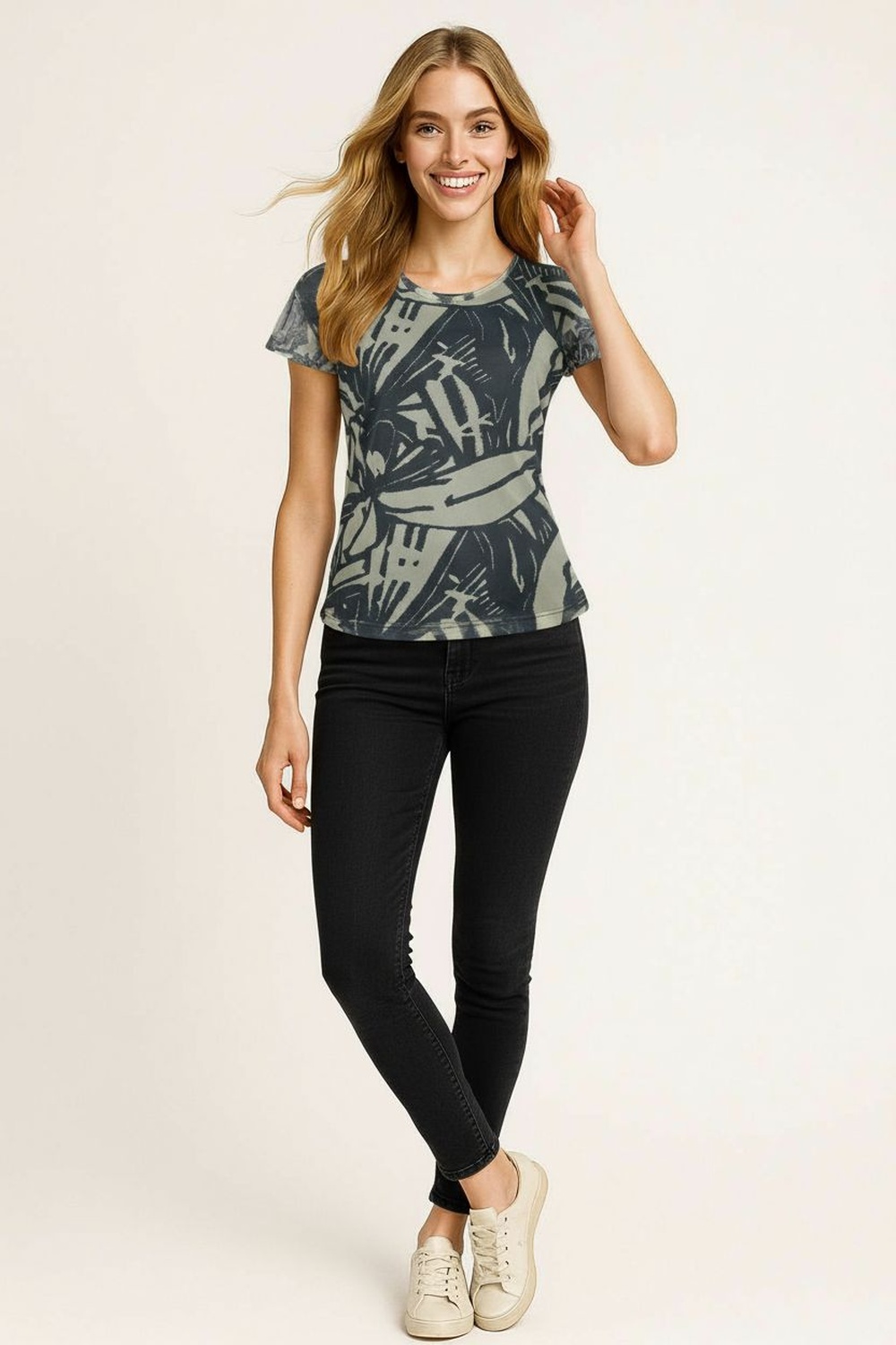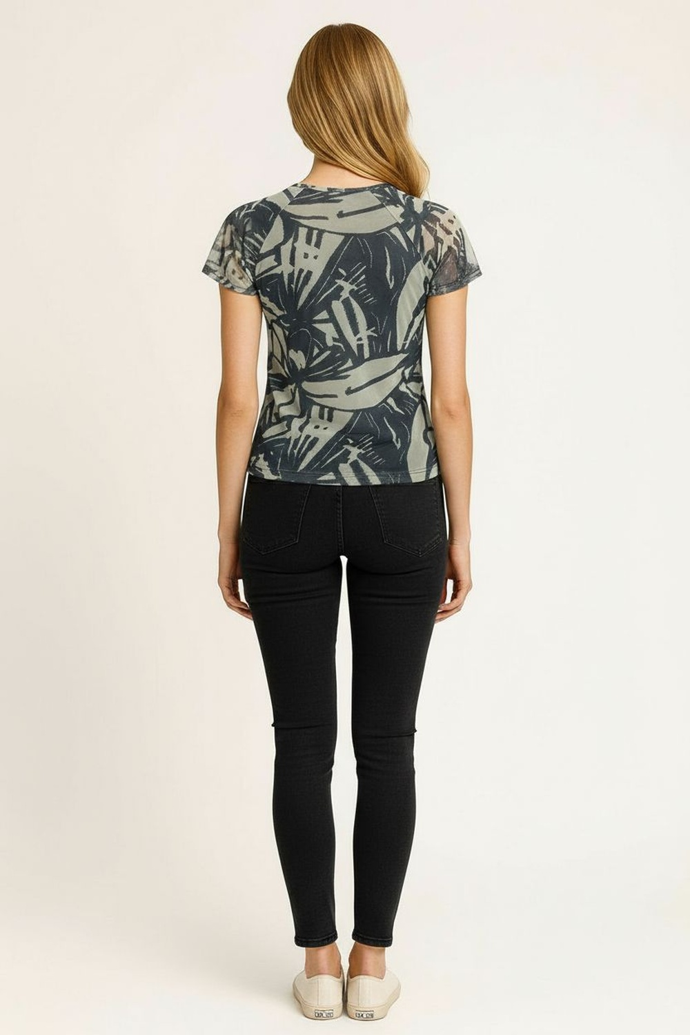 Playera de manga corta confeccionada en tejido tipo mesh con textura ligera, escote redondo y corte recto que brinda comodidad, acabado semitransparente que aporta un toque atrevido sin perder elegancia, dobladillo recto y confección flexible