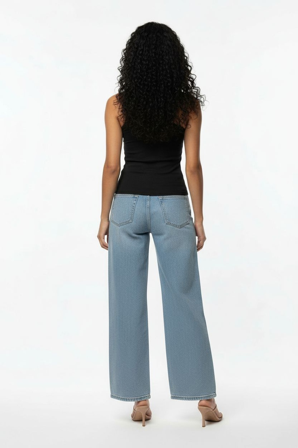 Conjunto de dos piezas con blusa de tirantes anchos, escote recto, botones frontales, pantalón de tiro alto con pretina, corte amplio, estructura ligera