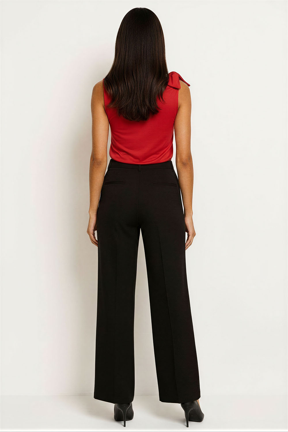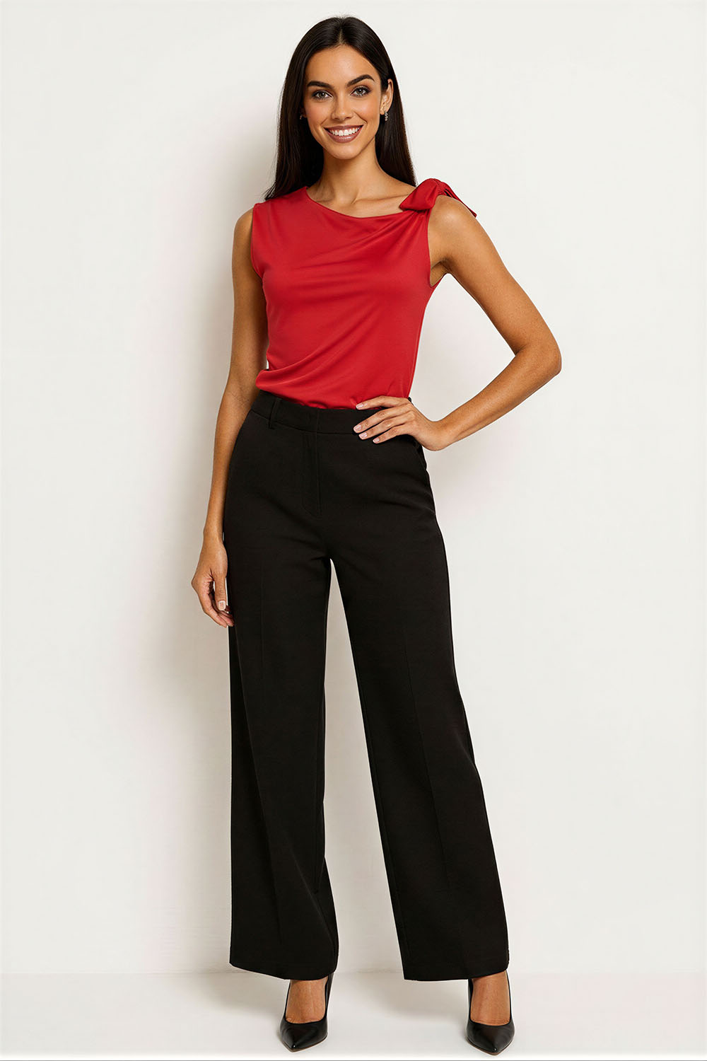 Blusa sin mangas, escote en pico con abertura frontal, cierre mediante jaretas ajustables al frente, corte recto con caída ligera, confección suave de ajuste cómodo