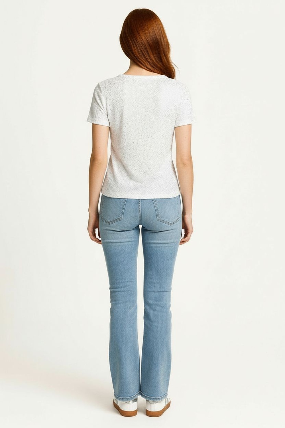 Playera corta de manga corta con cuello redondo, confeccionada en tejido tipo waffle con aplicación de foil metálico, textura ligera con brillo sutil, corte al cuerpo que resalta la figura, terminaciones limpias que aseguran un acabado cuidado