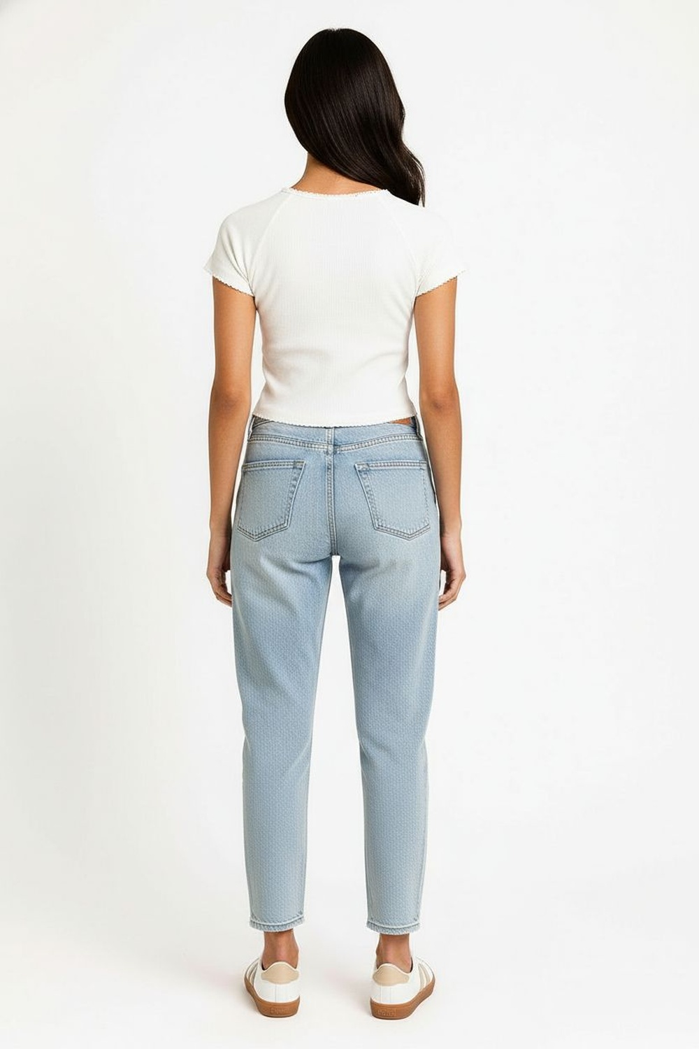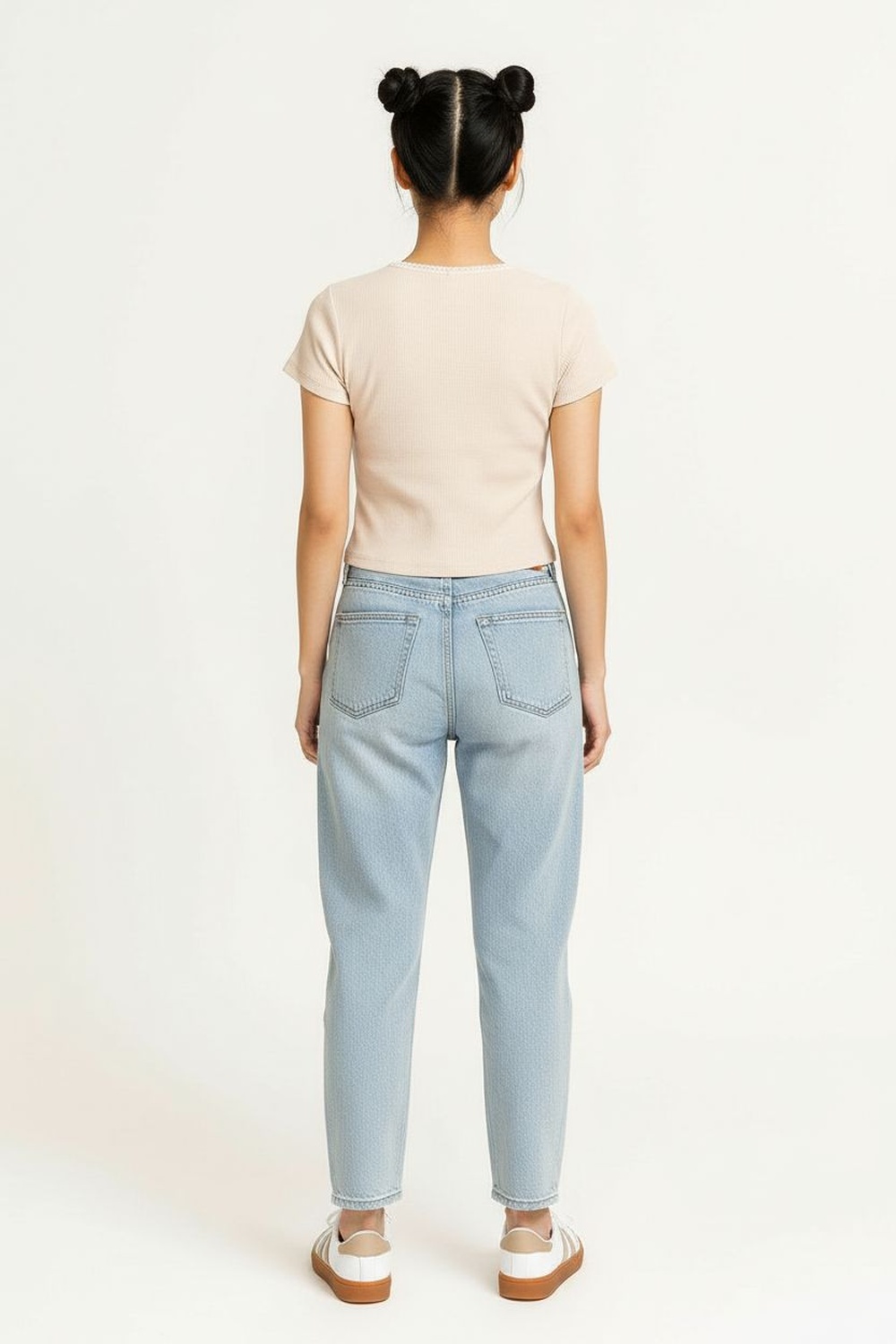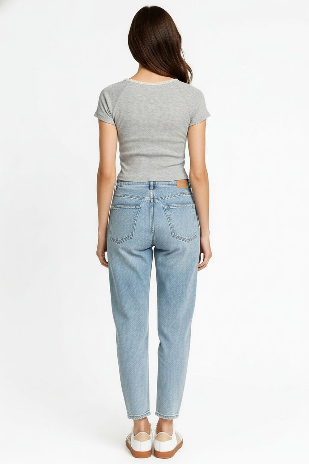 Pantalón de corte recto con pretina delgada y cierre frontal con botón metálico, diseño de tiro medio que aporta comodidad y un ajuste natural, bolsas laterales funcionales y pinzas posteriores que mejoran la forma, confección en tejido estructurado con textura suave que proporciona un acabado limpio y elegante, ideal para crear conjuntos versátiles de temporada