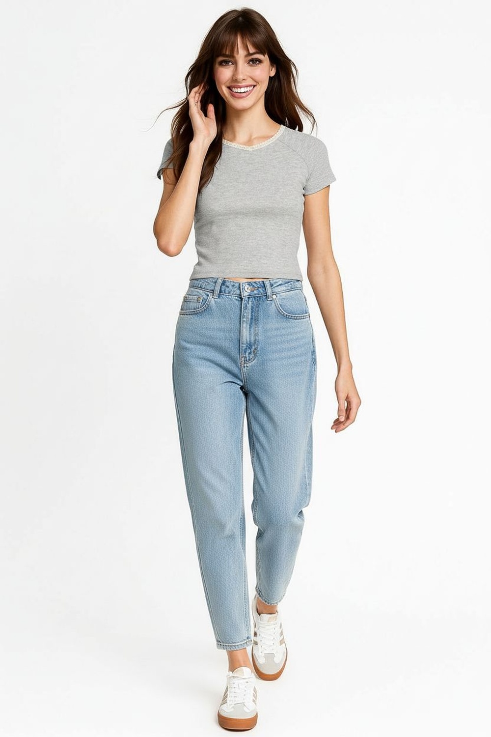 Playera de manga corta con corte ranglán que permite mayor movilidad, confeccionada en tejido tipo waffle de textura ligera y cómoda, cuello redondo con acabado delicado que aporta un toque casual, diseño corto que complementa looks relajados y modernos