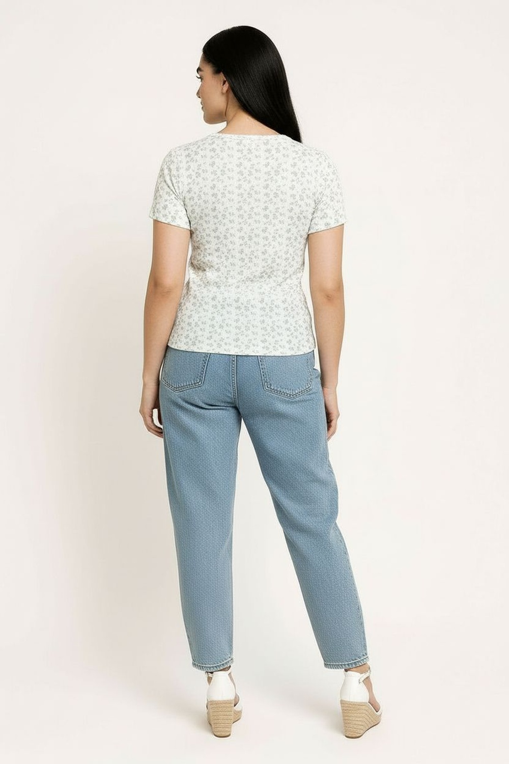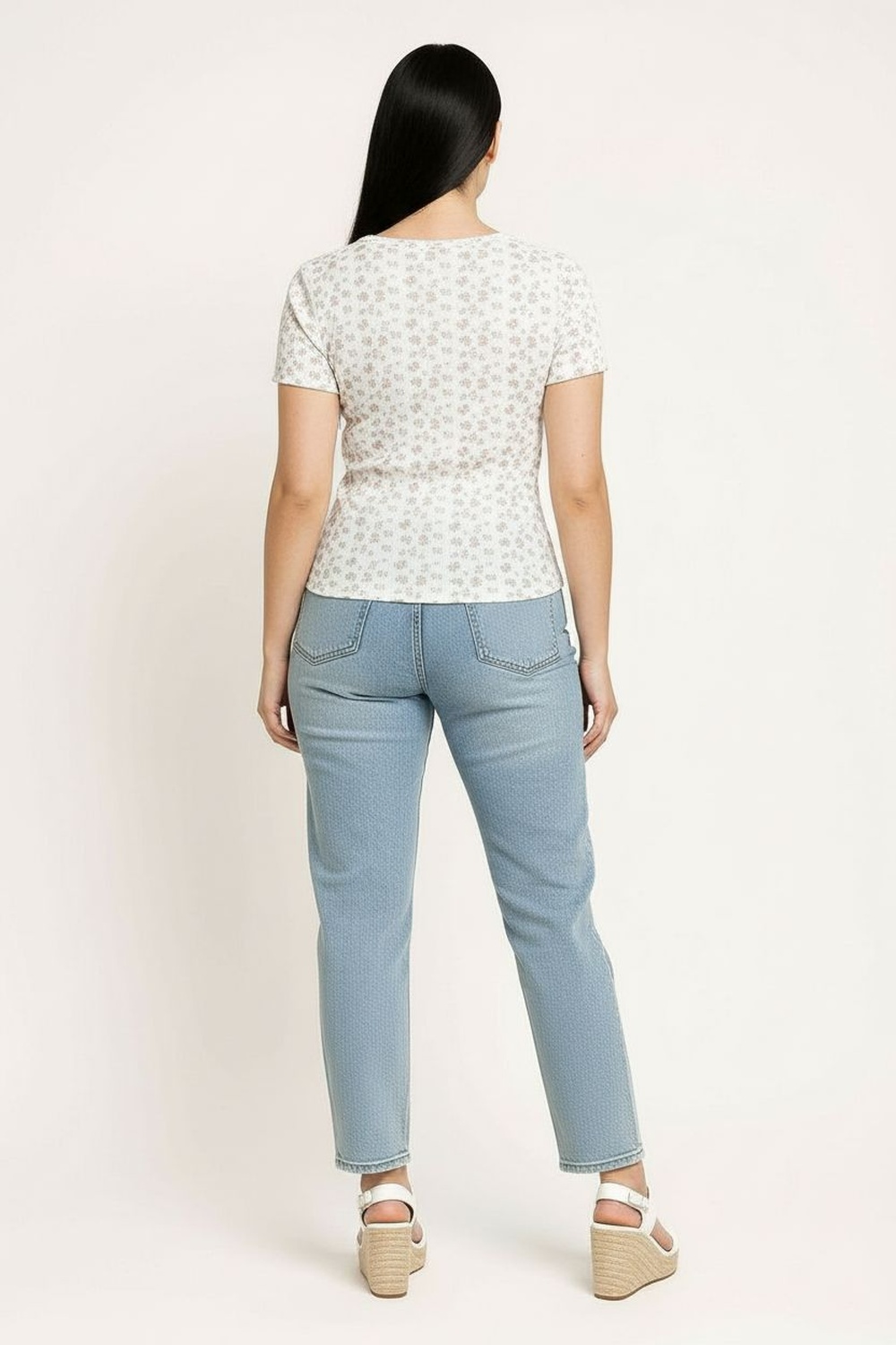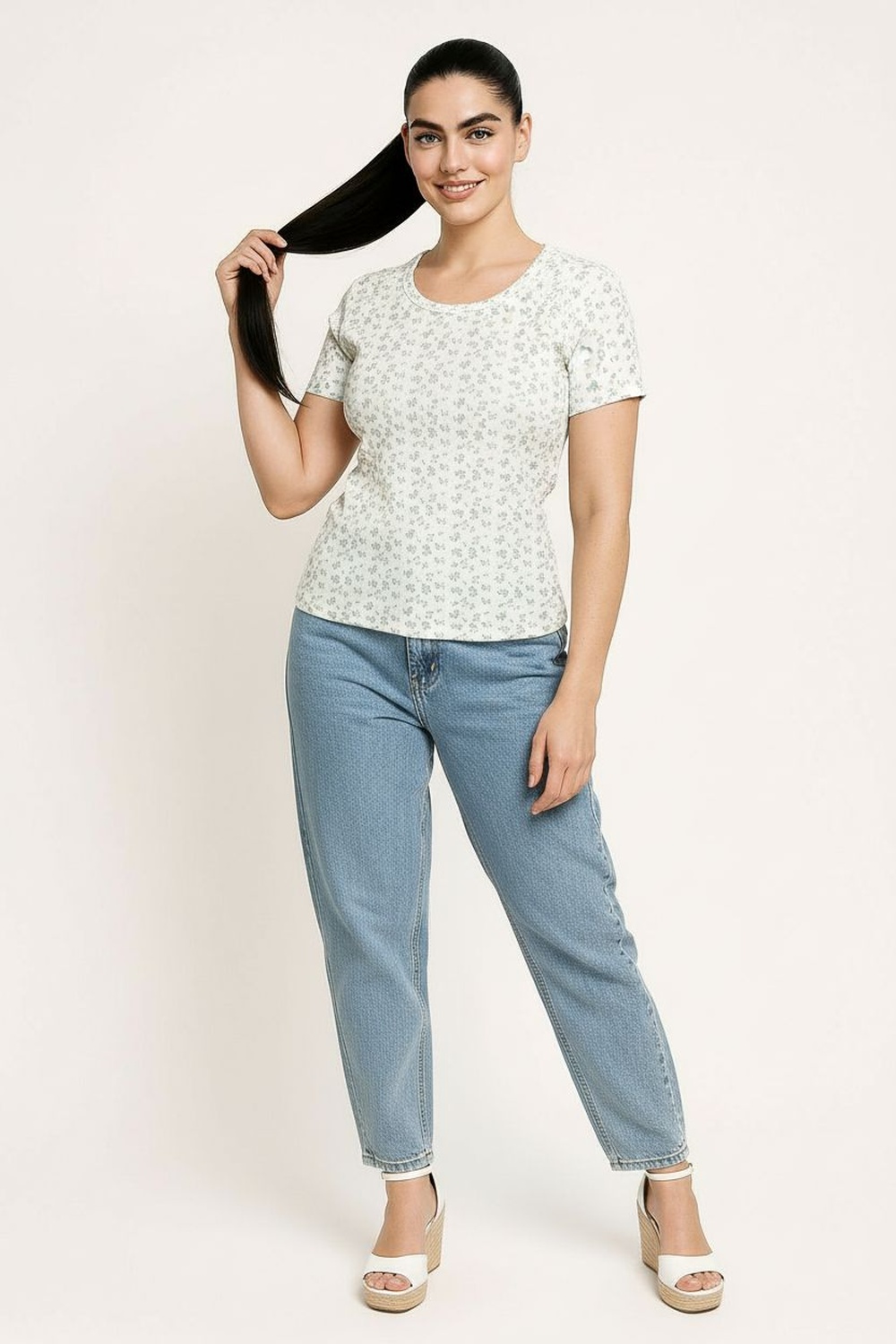 Playera de manga corta con escote redondo y corte recto que ofrece comodidad diaria, confección en tela ligera de tacto suave que se adapta al cuerpo, largo a la cadera que brinda cobertura adecuada, diseño integral que añade detalle visual atractivo para looks casuales