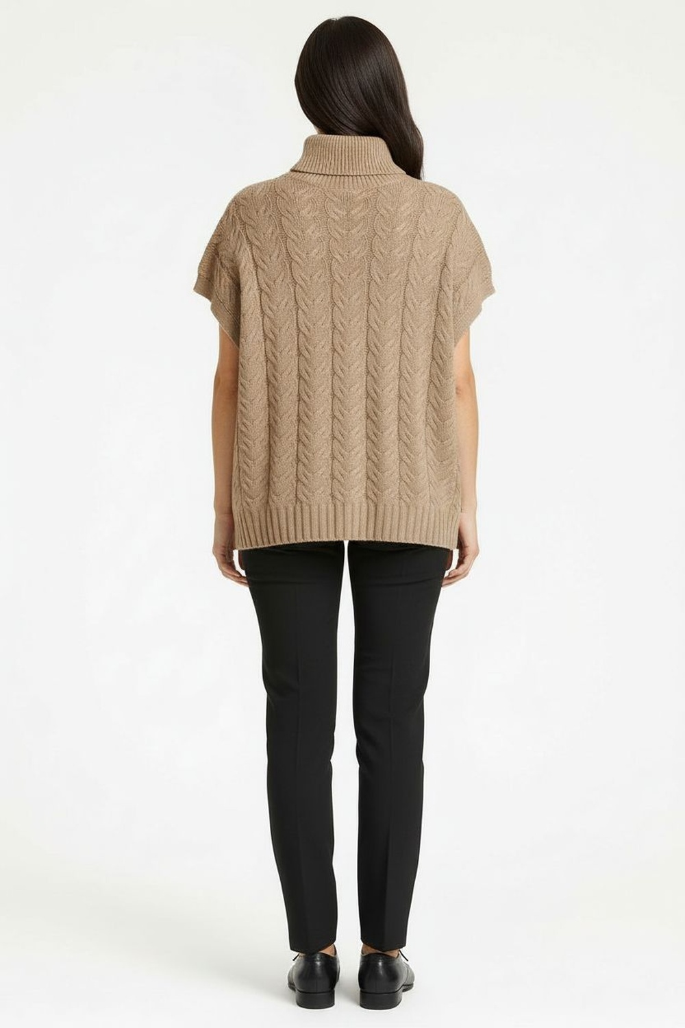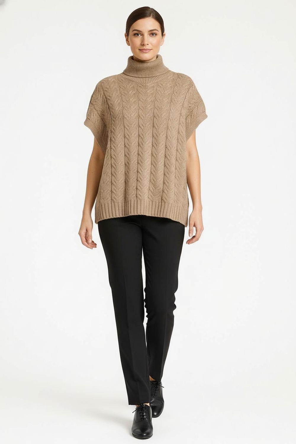 Poncho tejido con diseño de trenzas y cuello alto que aporta calidez, corte amplio con caída suave que brinda comodidad, acabado en canalé en cuello, puños y bastilla para mejor estructura, confección en tejido acrílico de tacto suave que mantiene la temperatura y ofrece una sensación acogedora