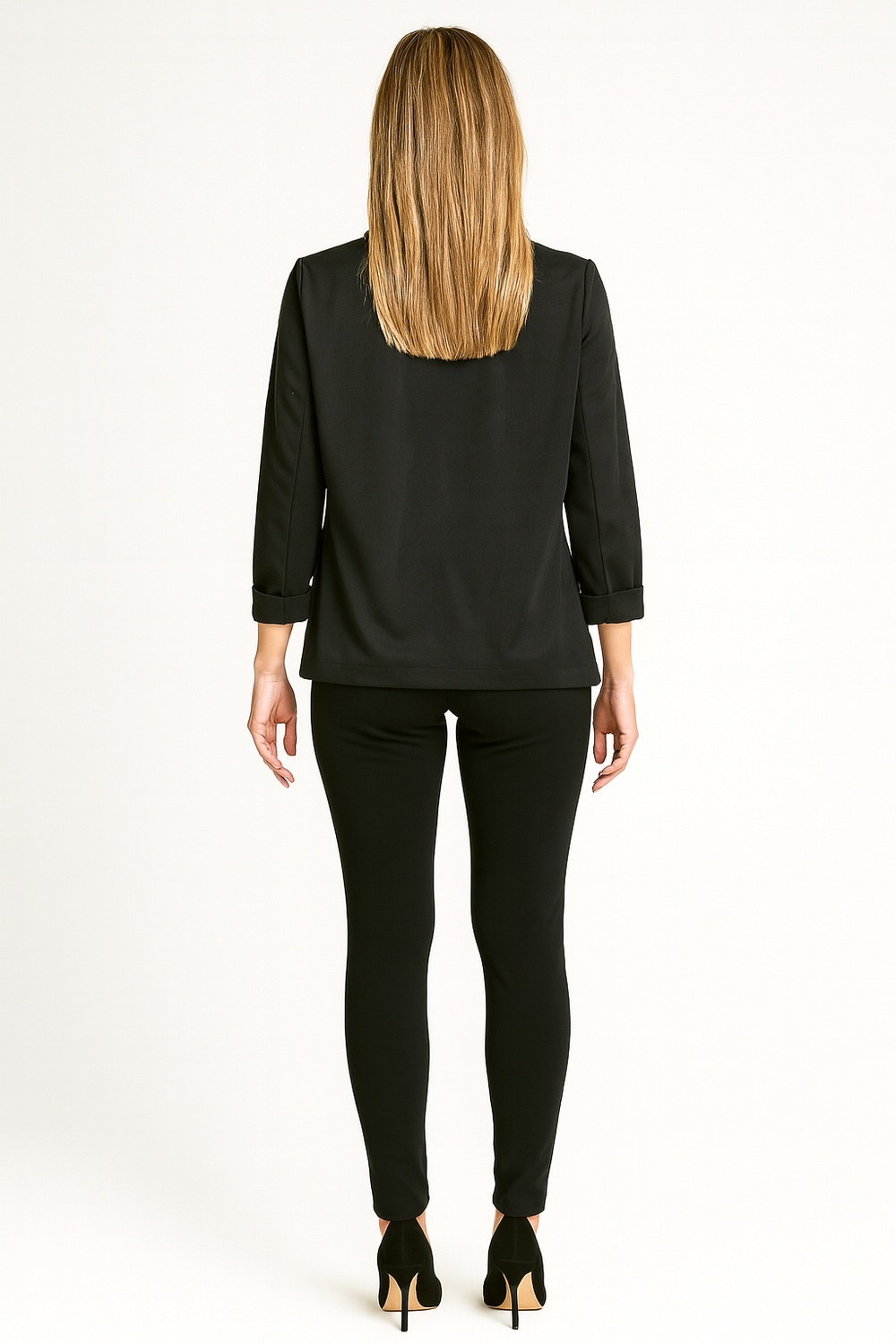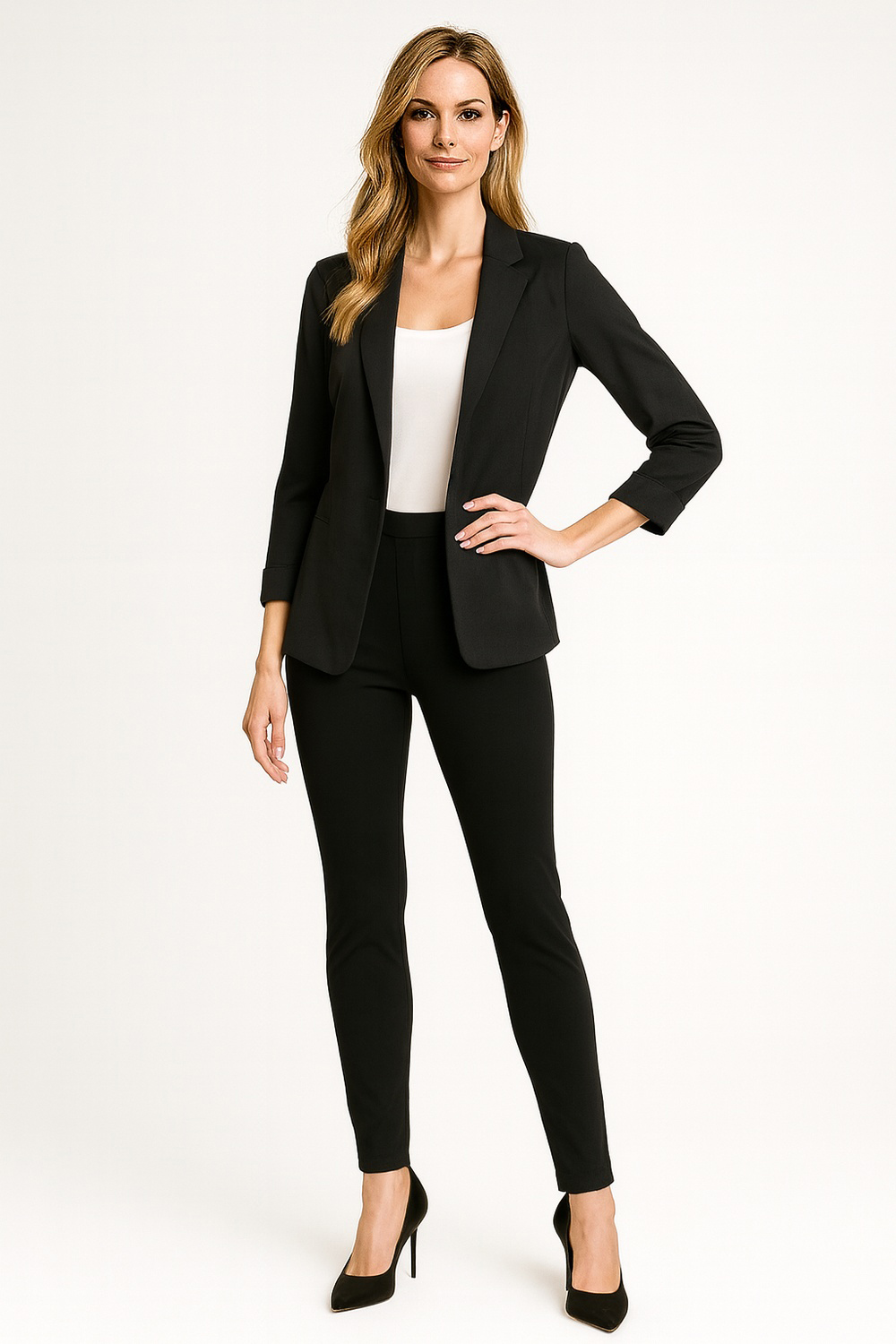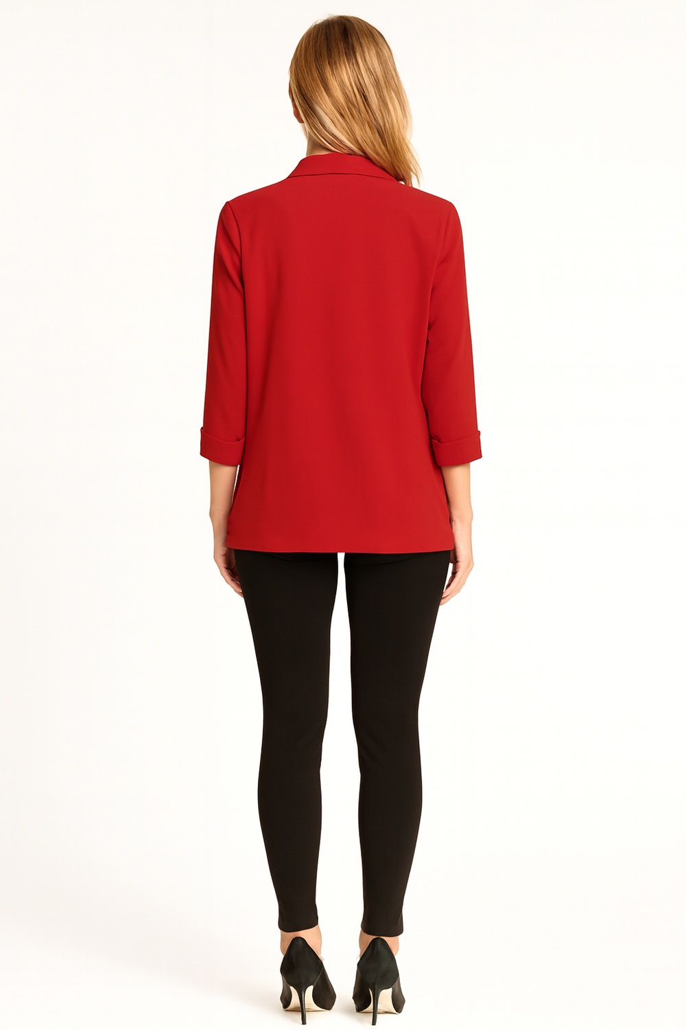 Saco de corte recto con diseño abierto al frente que aporta caída fluida, solapa clásica que estructura el torso, manga tres cuartos que brinda comodidad y practicidad, largo a la cadera que permite ajuste equilibrado, confección en tejido firme con acabado limpio y costura discreta