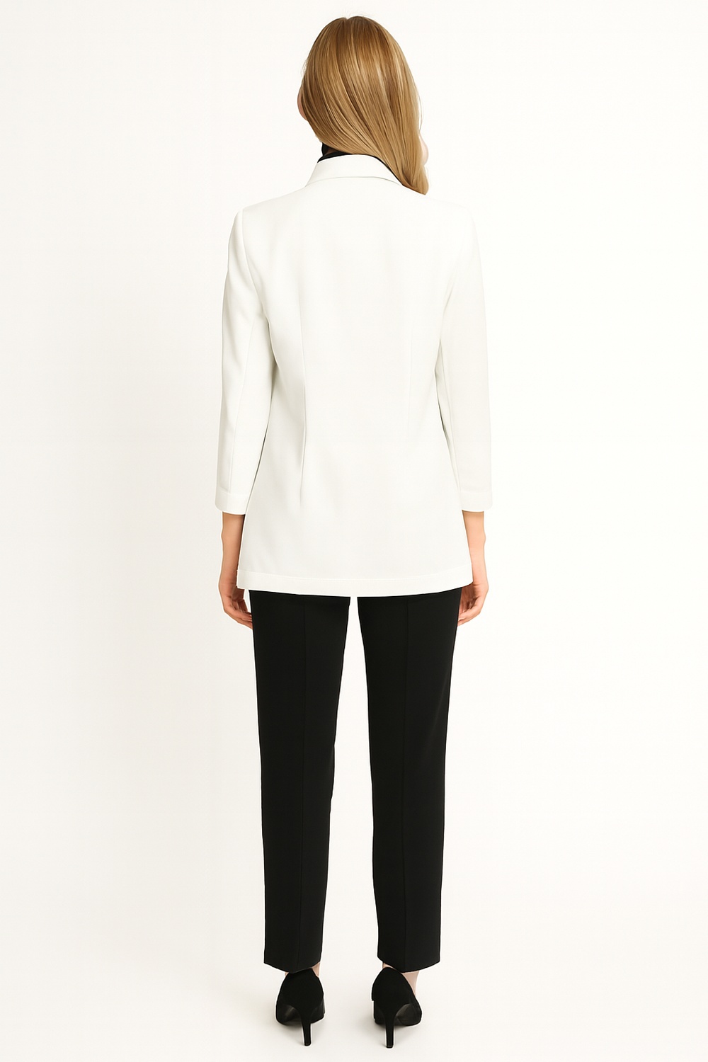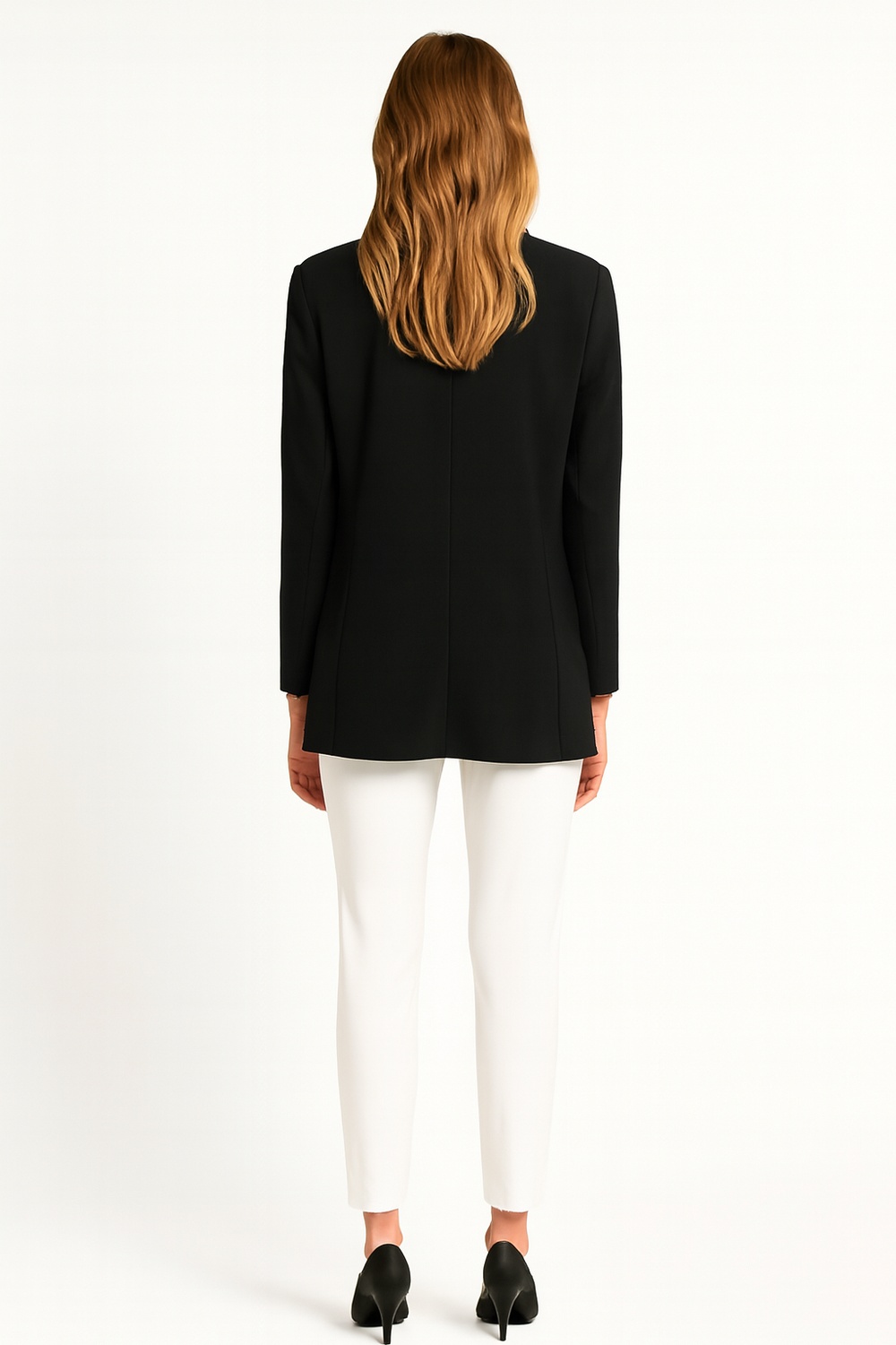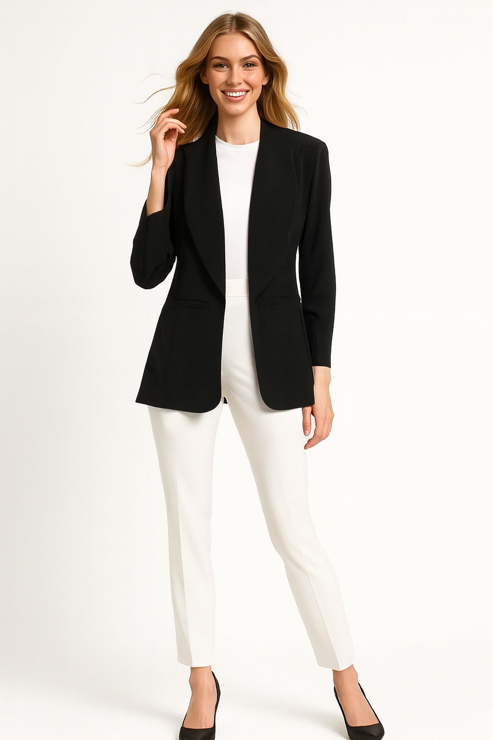 Saco de manga larga con solapa amplia y corte estructurado que estiliza la silueta, bolsillos laterales con vivos que aportan un acabado elegante, diseño abierto que brinda versatilidad, confeccionado en tejido suave con caída fluida, costuras reforzadas que aseguran mayor resistencia y durabilidad