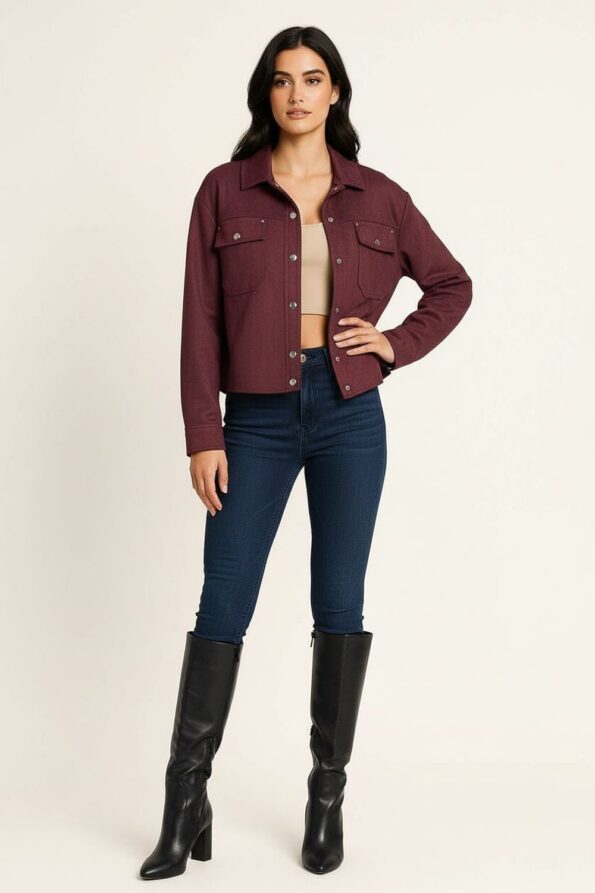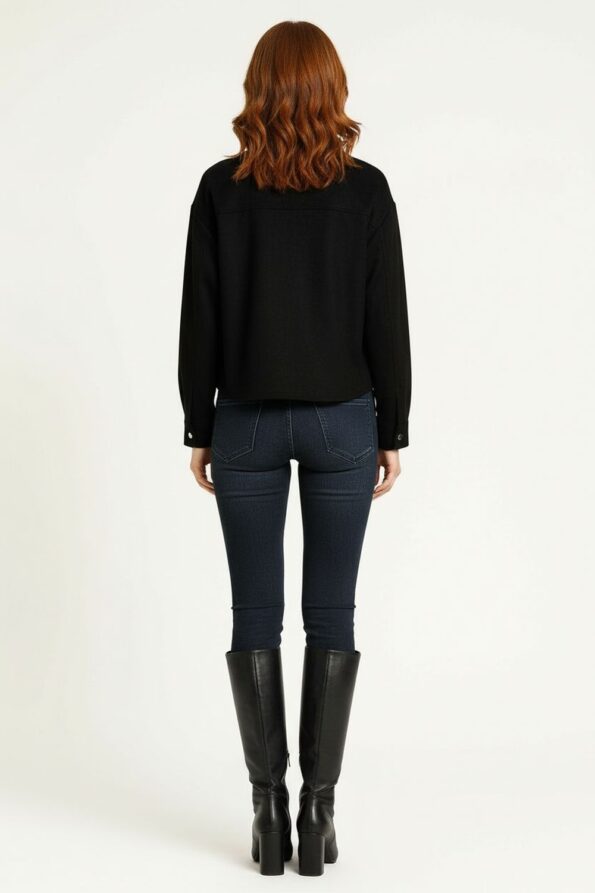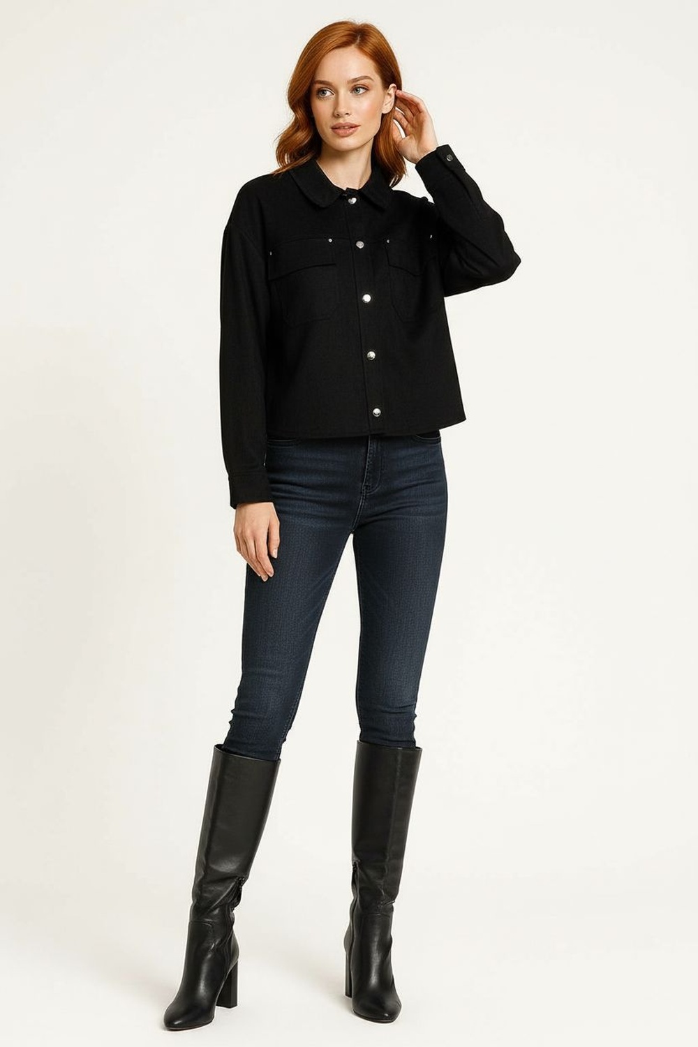Saco de manga larga con cuello camisero que aporta un estilo clásico, botonadura frontal metálica que brinda resistencia y realce al diseño, bolsas de parche al frente que añaden practicidad y un toque funcional, confección en tela estructurada que otorga comodidad y durabilidad, ideal para un look versátil y moderno
