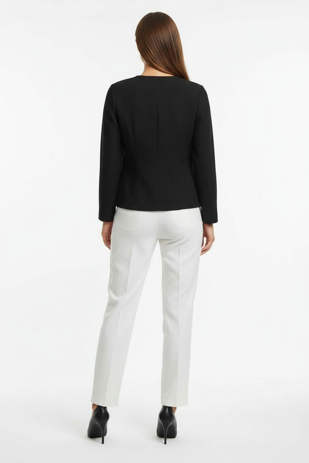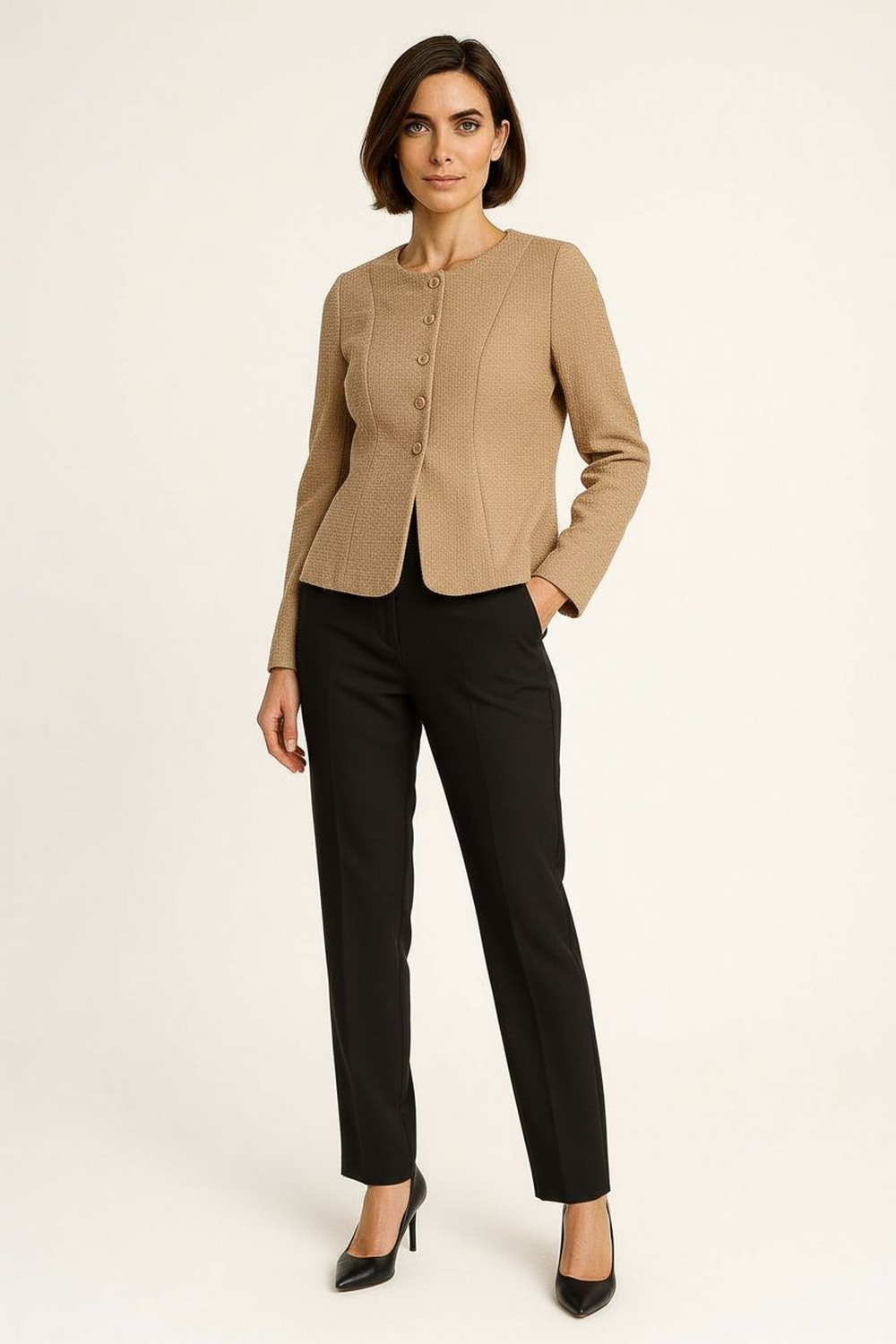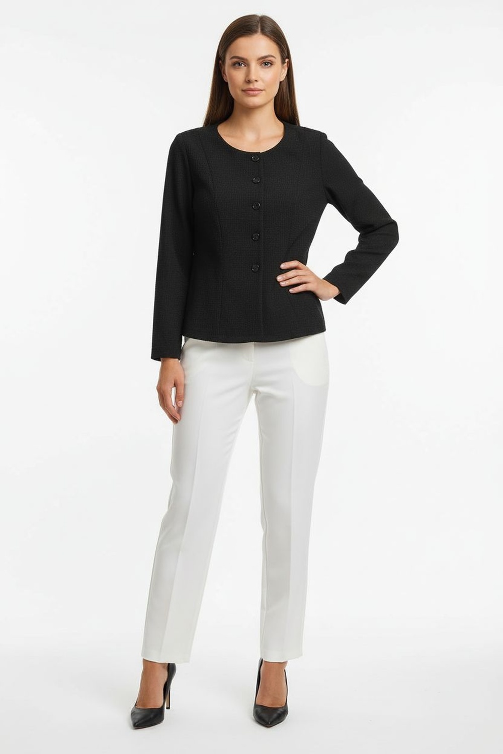 Saco de manga larga con cuello redondo y cierre de botones al frente, confeccionado en tejido con textura visible que aporta estructura, diseño clásico de caída recta
