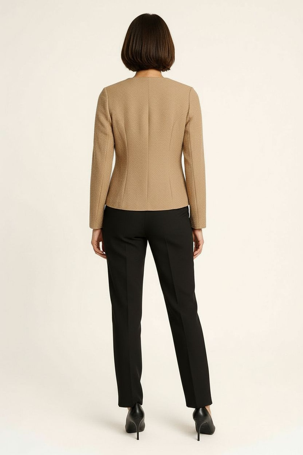 Saco abierto tipo blazer en tono camel que aporta elegancia sin esfuerzo, confeccionado en tela ligera y suave al tacto con caída fluida y solapa amplia que estiliza el rostro, su diseño sin botones lo convierte en una prenda versátil ideal para looks de oficina, formales, ejecutivos, blazzer