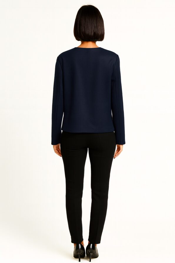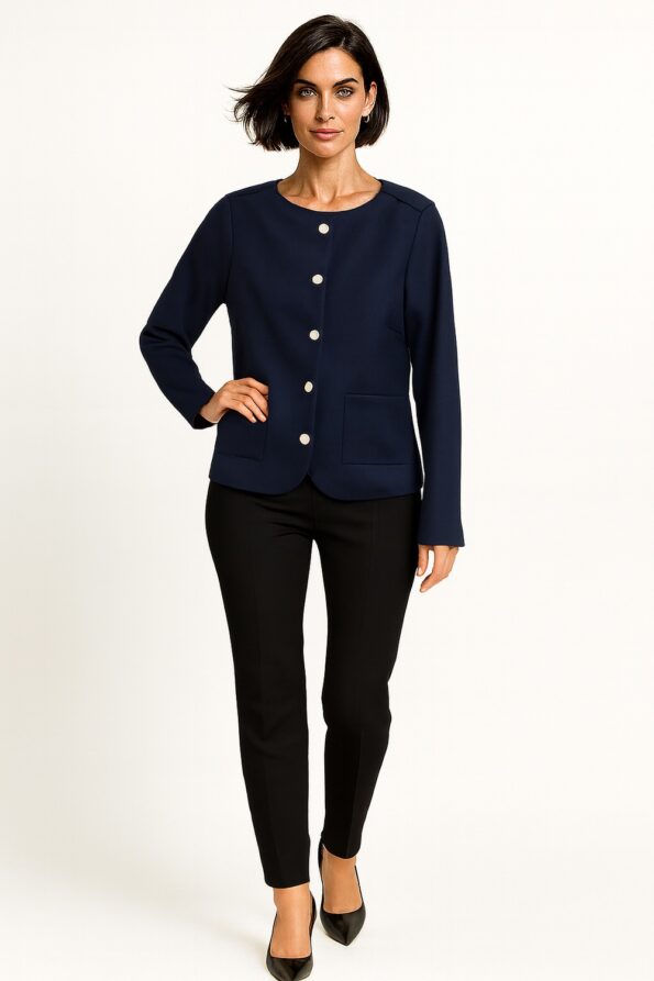 Saco de manga larga con cuello mao que aporta un estilo elegante y minimalista, botonadura frontal con botones decorativos que realzan el diseño clásico, bolsillos frontales funcionales que brindan practicidad, confección en tela estructurada que asegura firmeza y durabilidad, corte recto que favorece la silueta y ofrece versatilidad para distintos usos