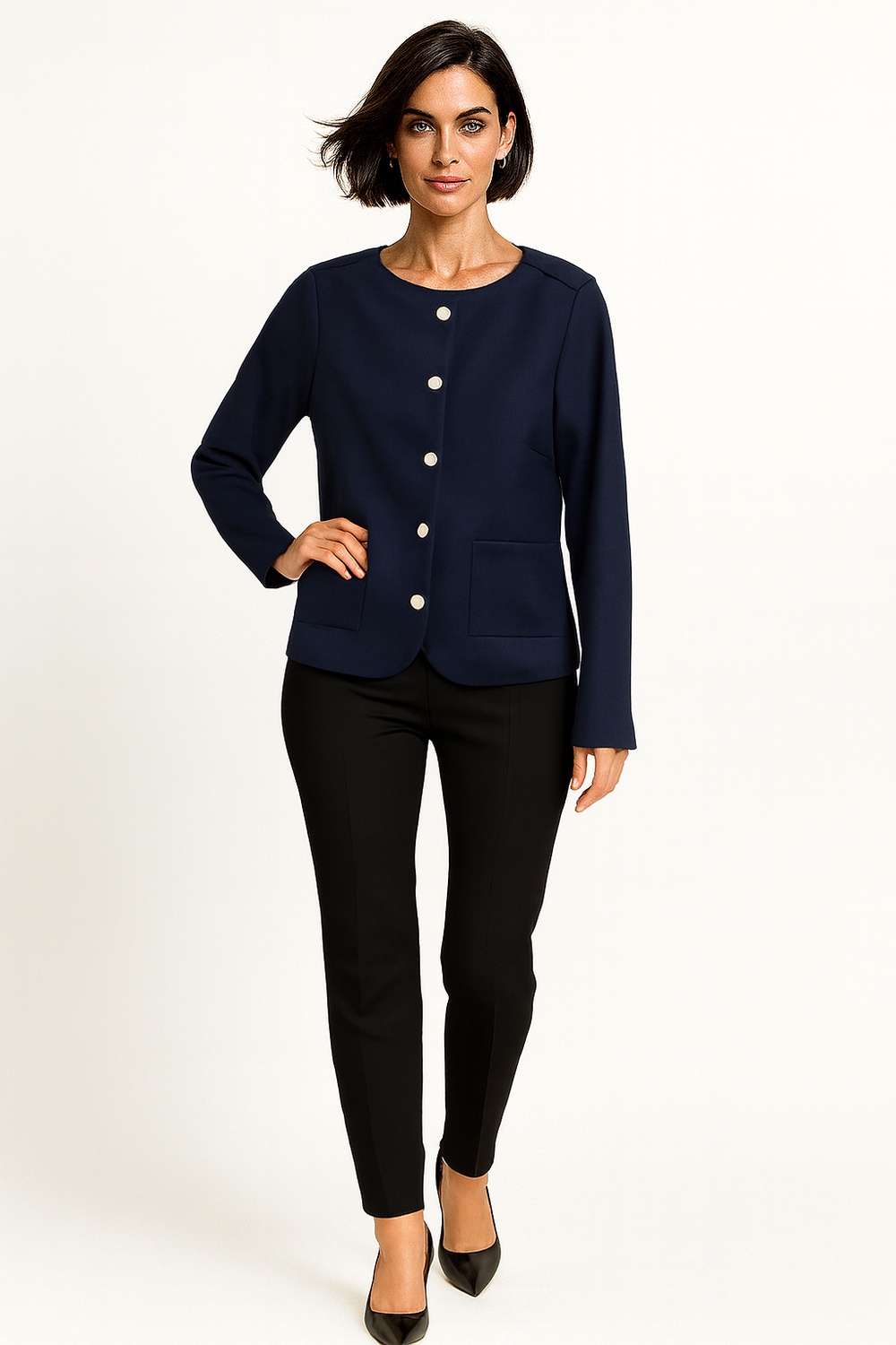 Saco de corte recto con solapa clásica, cierre frontal con dos botones para ajuste seguro, confeccionado en tela suave que brinda comodidad, incluye bolsillos con tapa para funcionalidad y estilo, ideal para crear conjuntos formales o de oficina con un acabado elegante