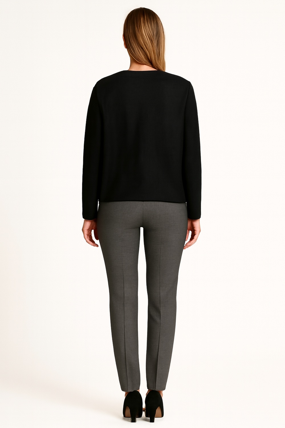 Chaleco largo abierto con solapa ancha de caída fluida que aporta movimiento y presencia, silueta alargada que estiliza la figura, cualquier outfit con un toque moderno, profesional y formal sin esfuerzo