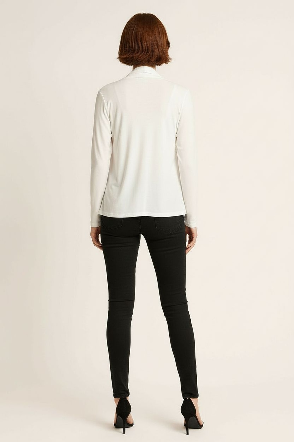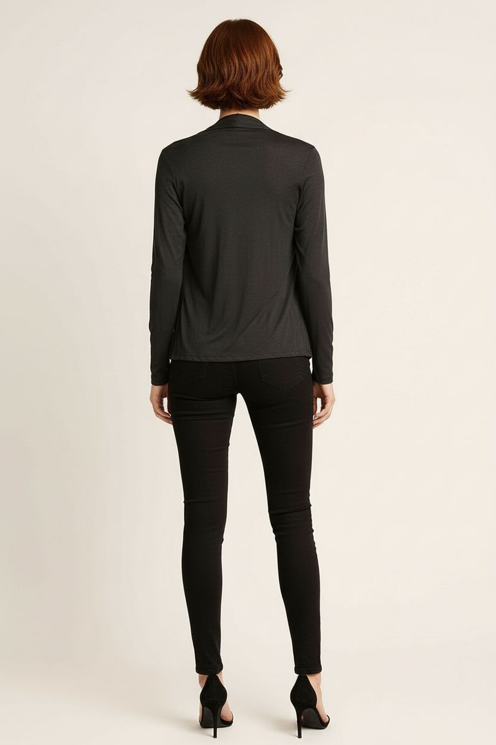 Ensamble con solapa frontal abierta que aporta caída fluida, manga larga de corte recto que brinda cobertura ligera, largo medio que equilibra la silueta, diseño sin cierre para colocación práctica, confección en tejido suave de tacto ligero que permite uso continuo