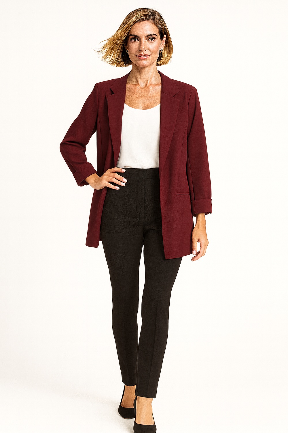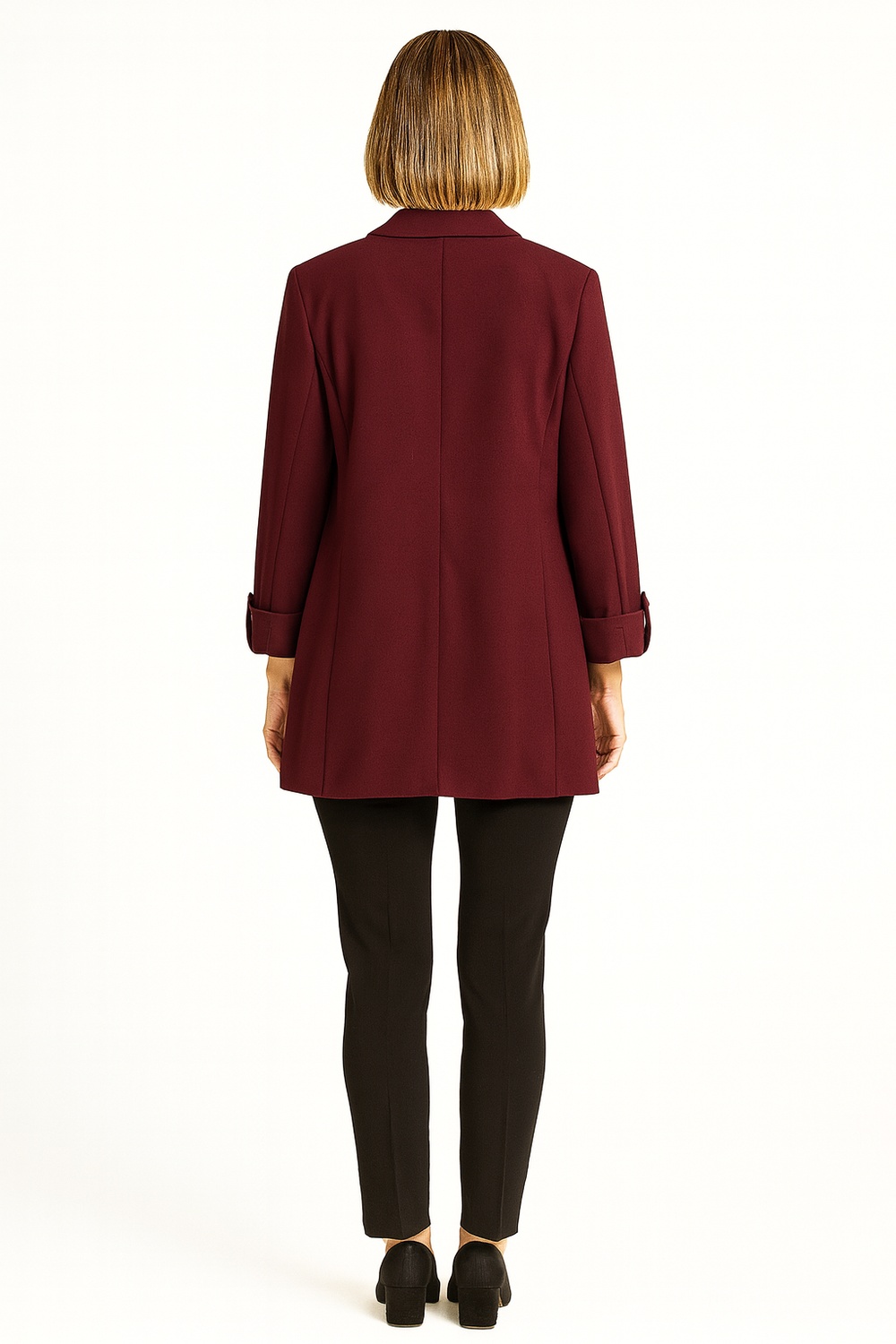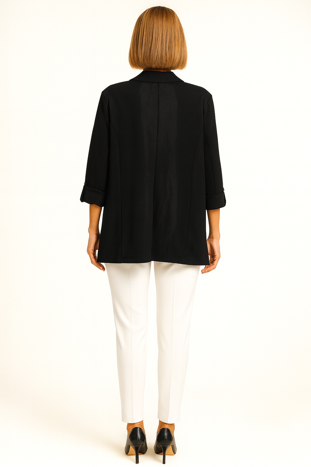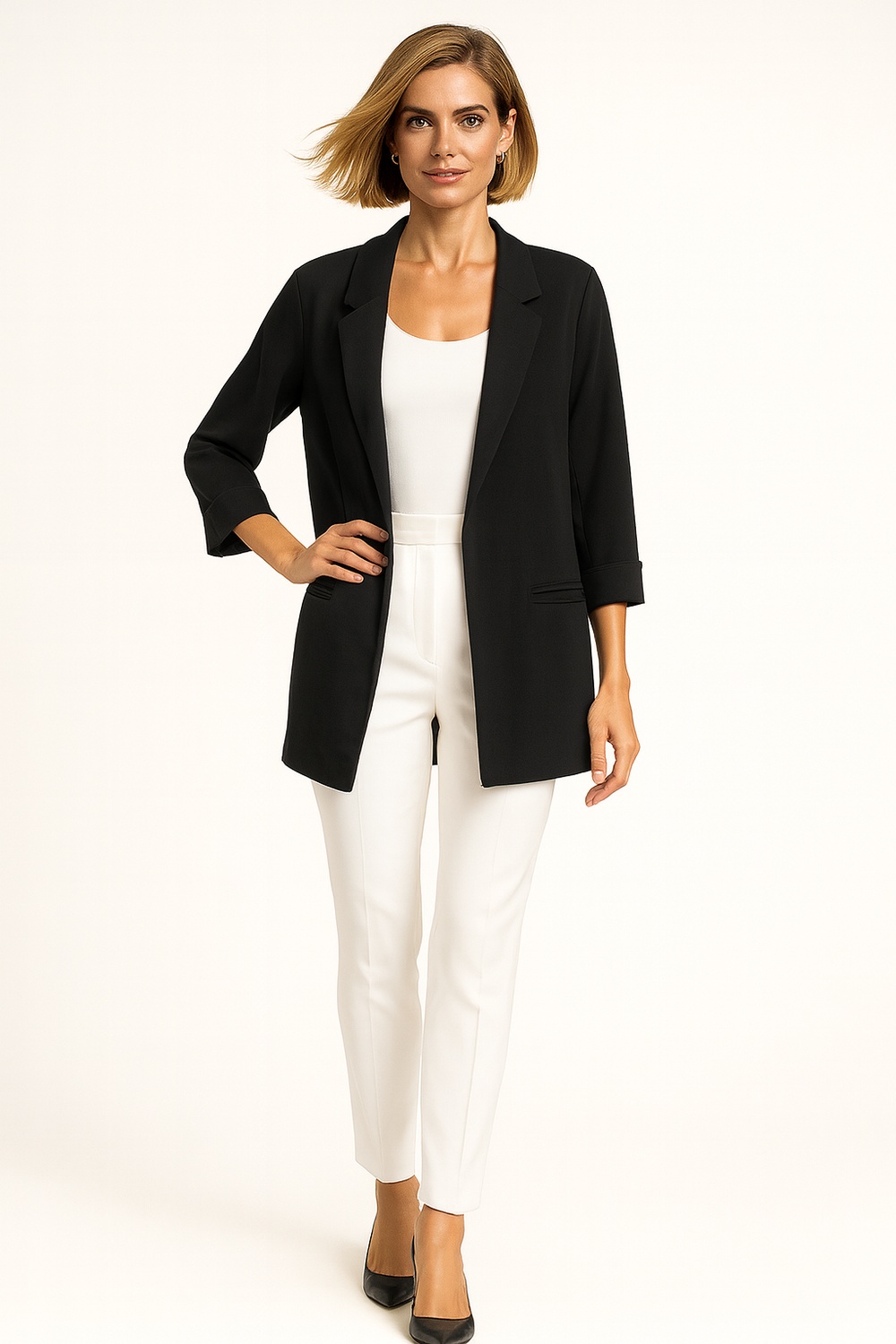Saco abierto con solapa clásica y mangas tres cuartos con doblez que aportan un estilo moderno, corte estructurado que define la silueta, diseño sin botones que brinda versatilidad, confeccionado en tejido ligero con acabado elegante, costuras reforzadas que aseguran durabilidad